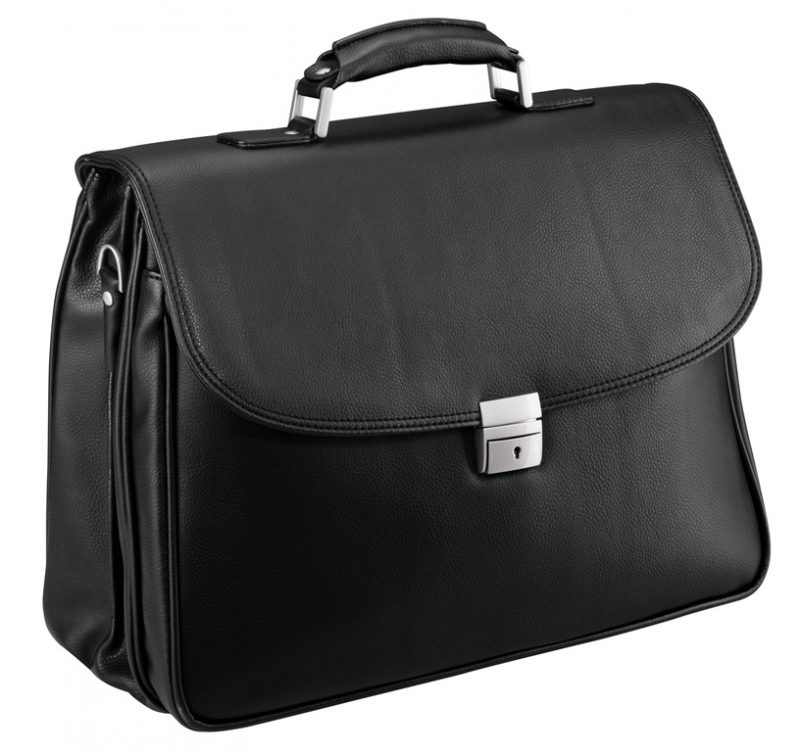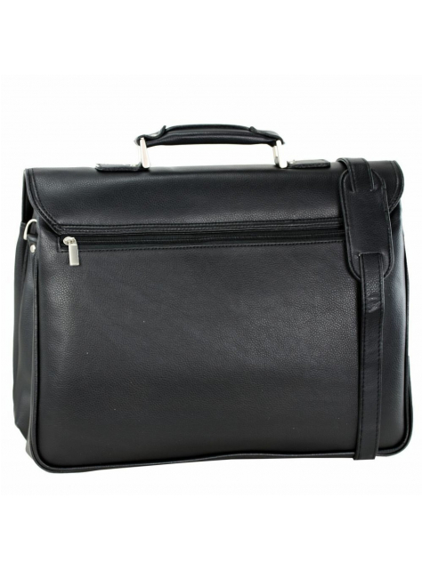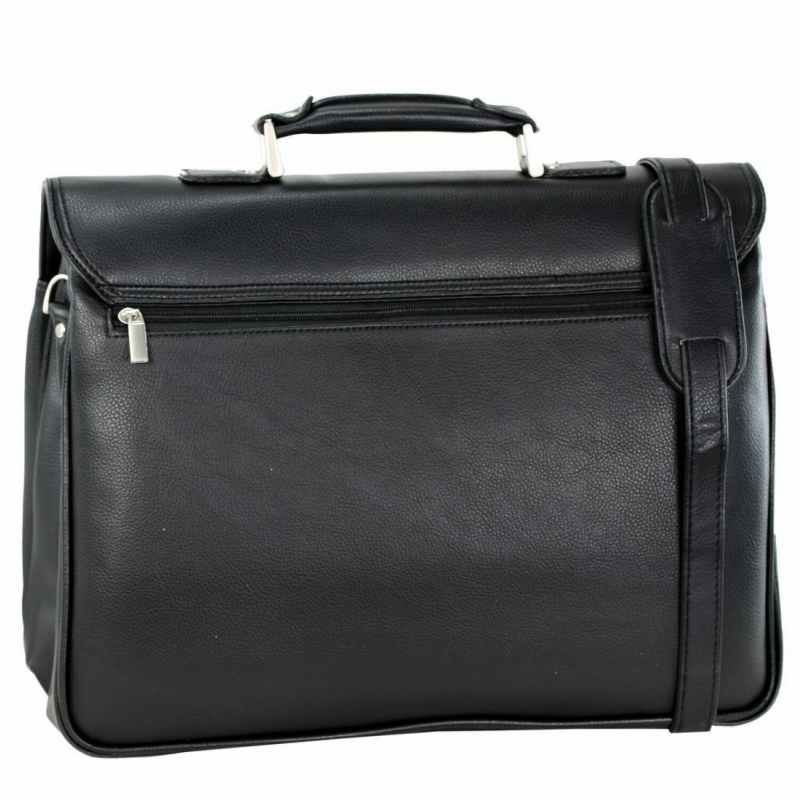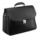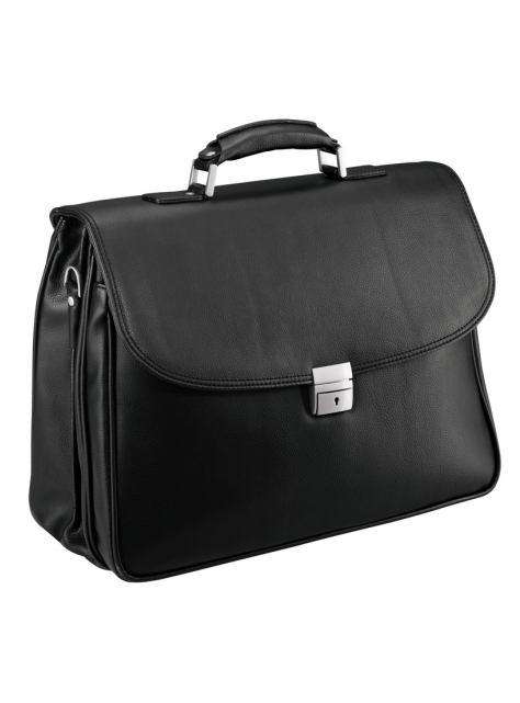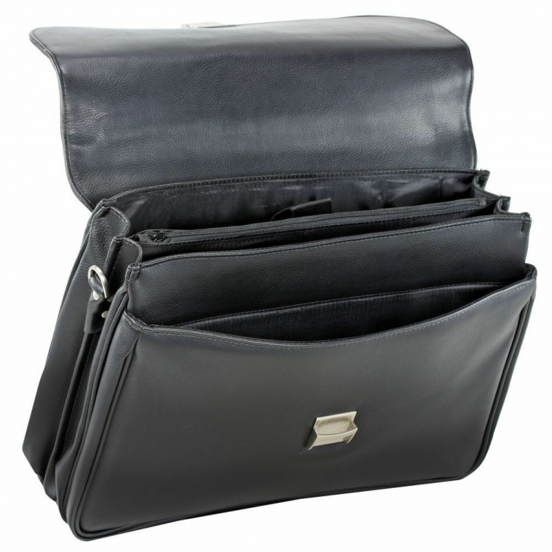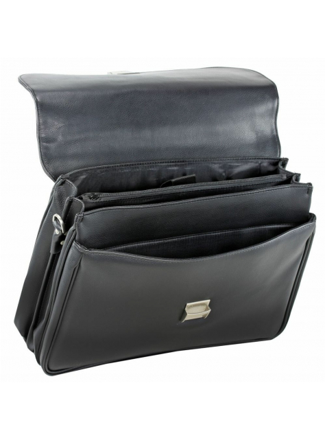 Priestranná aktovka z čiernej koženky s bohatým úložným priestorom pre dokumenty a s polstrovaným oddelením na notebook.