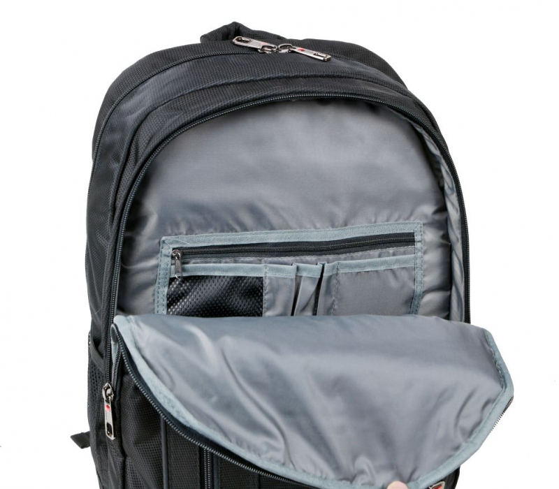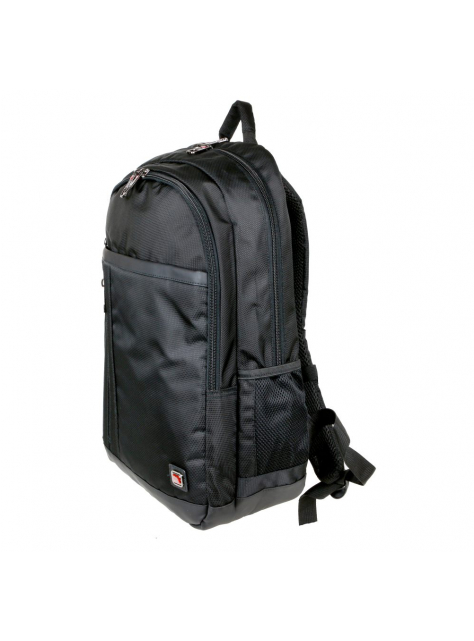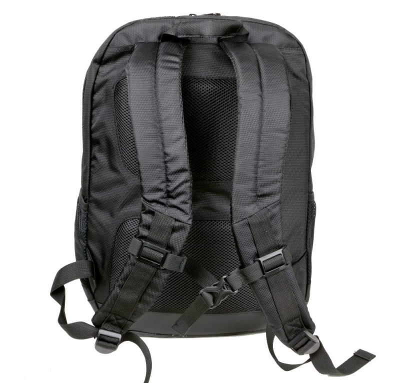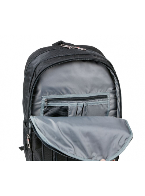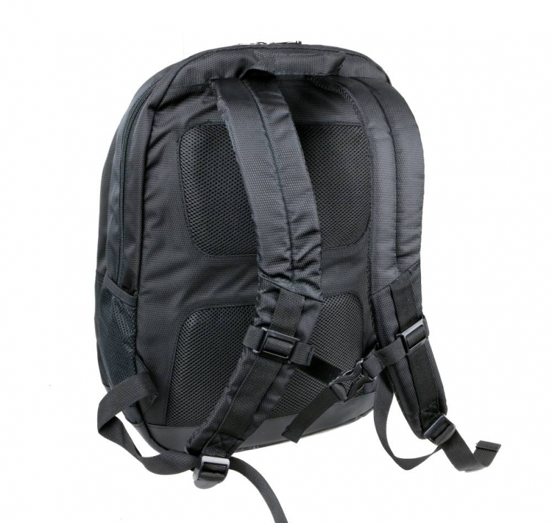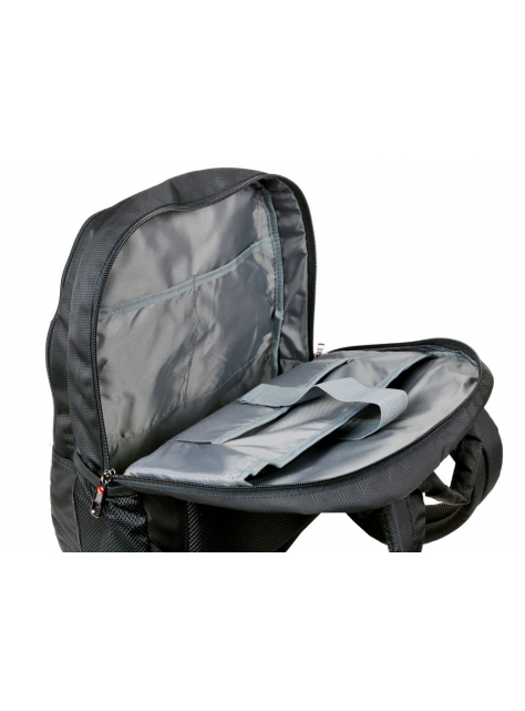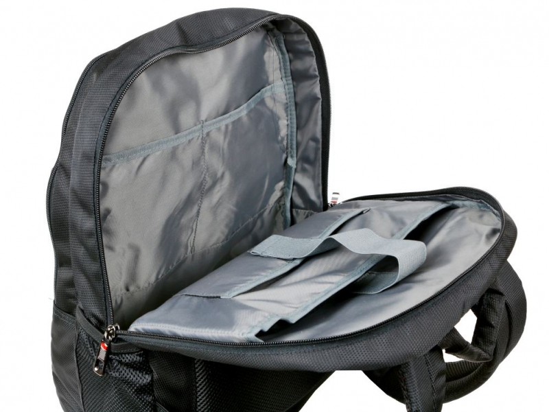 - hlavný priestor polstrovaný, doplnený postranným priečinkom s popruhom na suchý zips pre zaistenie notebooku (max 17"- 29x32x2 cm) a plochým priečinkom na tablet (do 10"-20x25 cm), 2 otvorenými postrannými vreckami