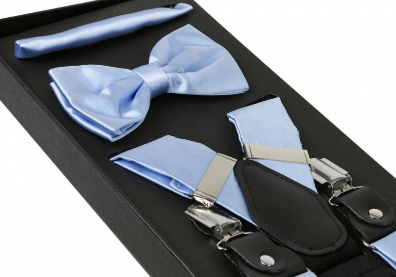 Štýlová elegantná pánska 3-dielna súprava v darčekovej krabičke. Farba - belasá (svetlá modrá). Jednofarebný hladký satén.