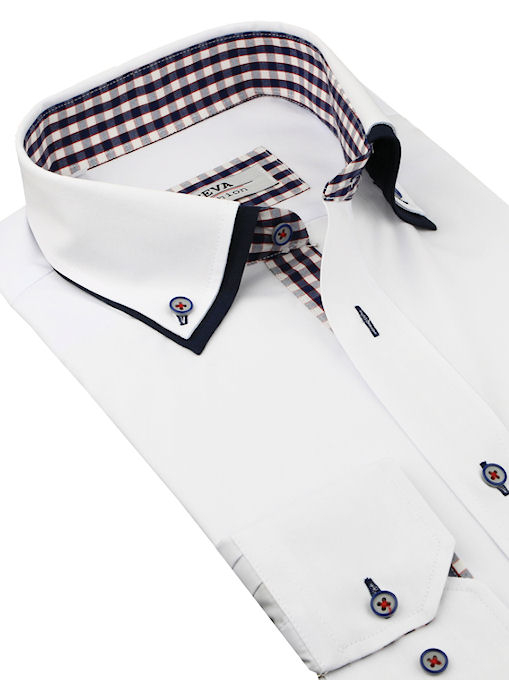 Trendová pánska košeľa s kontrastným podšitím z novej kolekcie BEVA Fahion. Klasický voľný strih, na výšku postavy 176 - 182 cm.