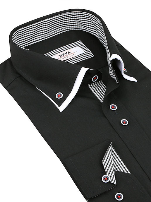 FAREBNÉ PREVEDENIE: čierna hladká košeľa, podšitie z hladkej bielej tkaniny, bielo-čierna károvaná tkanina na manžetách, lége a vnútornom golieri