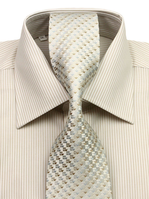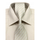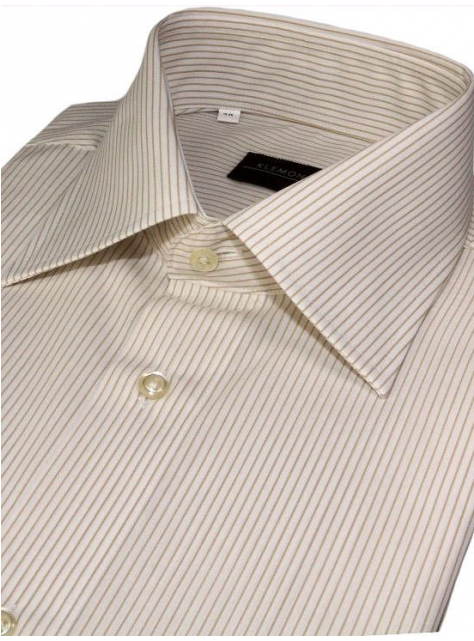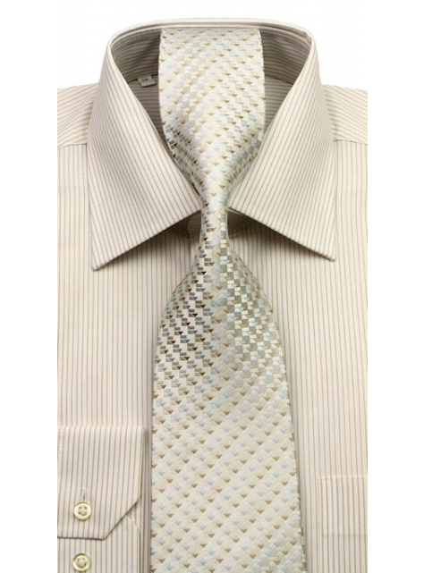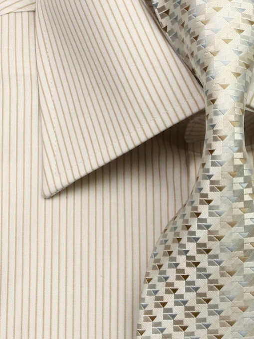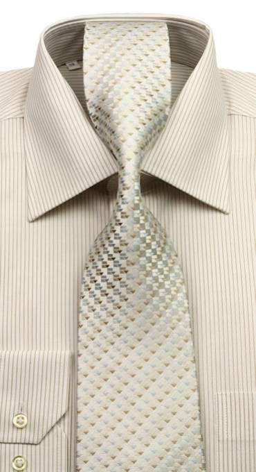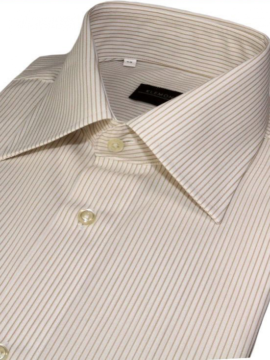 Pánska košeľa s dlhým rukávom v klasickom voľnom strihu s manžetami na gombíky - obleková košeľa so vzorom pieskovo-béžových prúžkov, vhodná na nosenie s kravatou alebo bez kravaty.