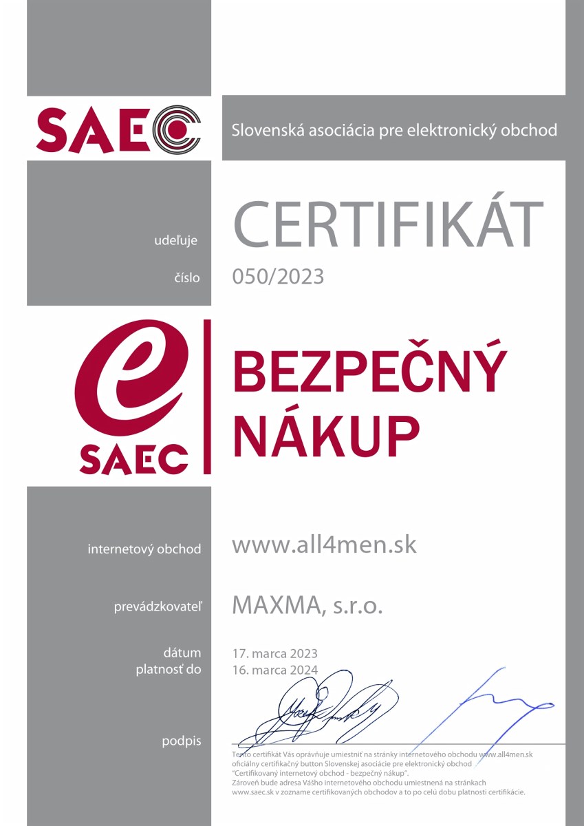 Internetový obchod All4Men.sk opakovane získal dňa 17. marca 2024 po štrnásty histórii svojho pôsobenia na slovenskom internetovom trhu Certifikát bezpečného nákupu, ktorý udeľuje nezávislá Slovenská asociácia pre elektronický obchod - SAEC. Certifikovaný obchod SAEC - Bezpečný nákup prináša zákazníkom internetových obchodov záruku bezpečného nákupu a spoľahlivého obchodníka.