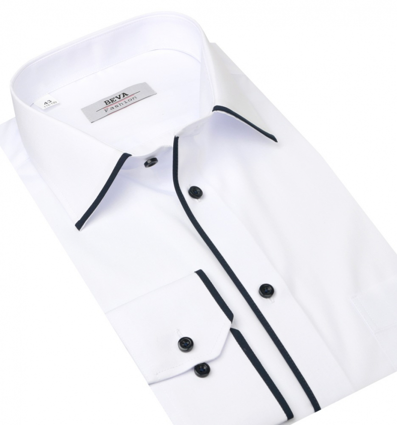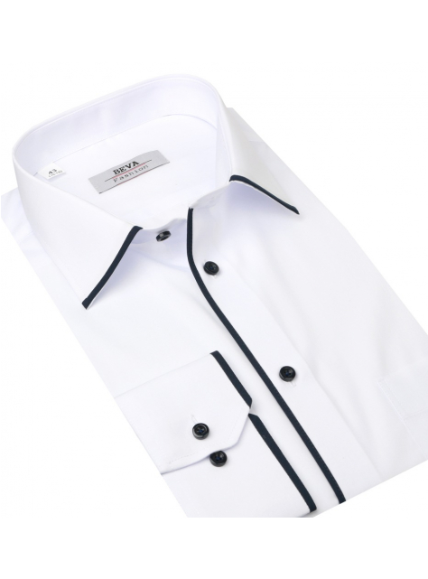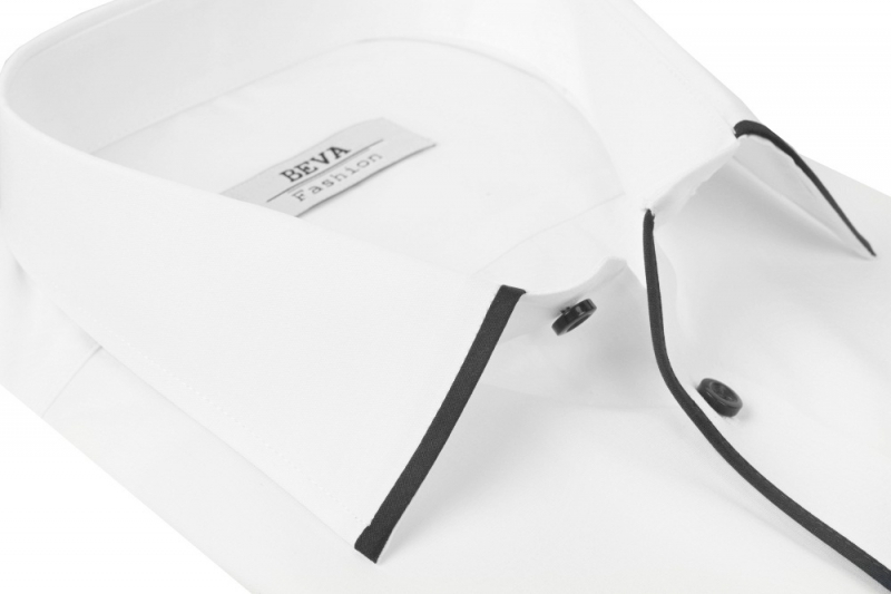 Elegantná pánska slim košeľa BEVA Fashion - košeľa na spoločenské príležitosti aj bežné nosenie. Hladká snehobiela košeľa s čiernym lemovaním a gombíkmi.