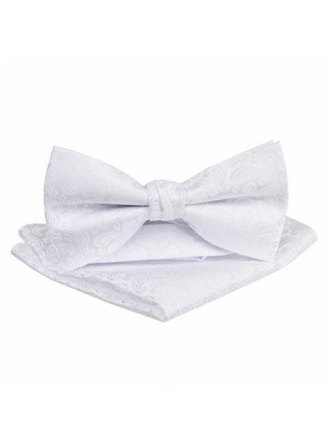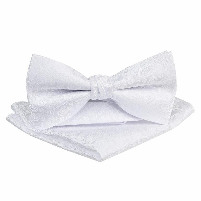 Elegantná pánska spoločenská súprava - motýlik a vreckovka v bielej farbe s kašmírovým paisley vzorom.