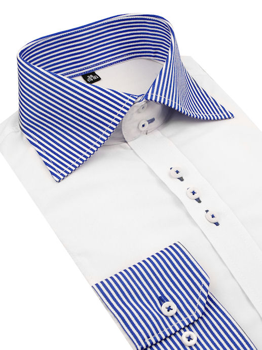 FAREBNÉ PREVEDENIE: biela hladká tkanina, golier, manžety a podšitie légy z bielo-modrej prúžkovanej tkaniny