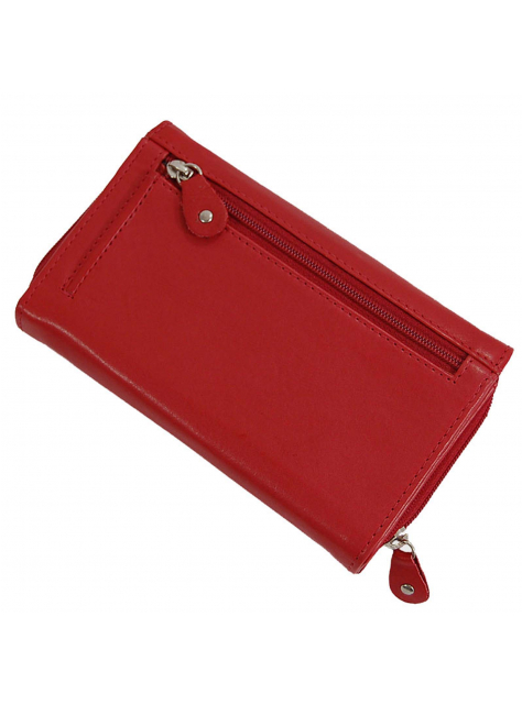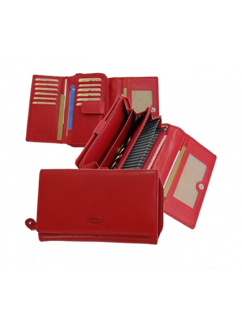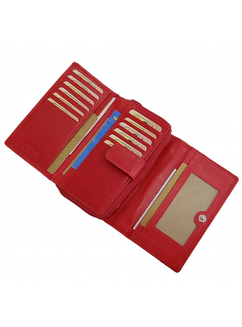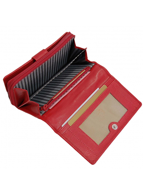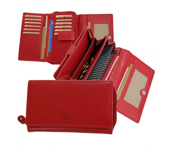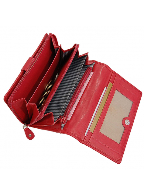 Kožená dámska peňaženka vo väčšom formáte - vyrobená z hebkej akostnej kože v červenom malinovom odtieni. Uzatváranie na kovový patent. Obsahuje veľký mincovník so zipsom, priečinky pre 12 kariet, samostatné oddelenie na doklady a karty so zapínaním na pracku.