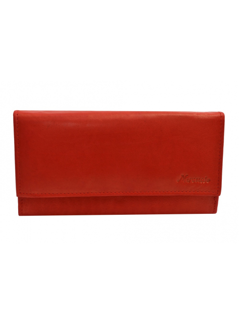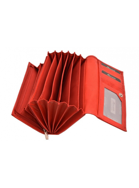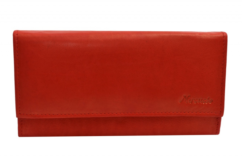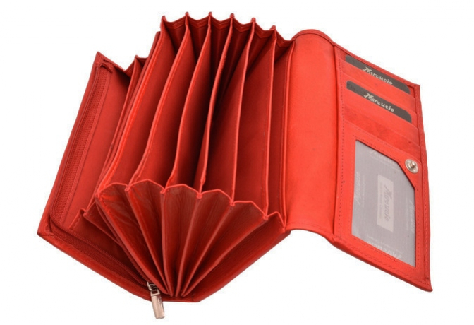 Listová dámska peňaženka MERCUCIO čašníckeho typu zo zamatovo-hladkej kože v červenej farbe. Uzatváranie poklopom s kovovým patentom, široké vejárové otváranie.