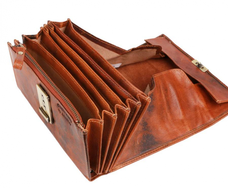 Elegantné uzatváranie na kovový patent v troch voliteľných výškach, široké vejárové otváranie. Obsahuje vejárovité priečinky pre bankovky, 2 mincovníky: celokožený francúzsky mincovník (brúsená koža). plochý mincovník so zipsom.