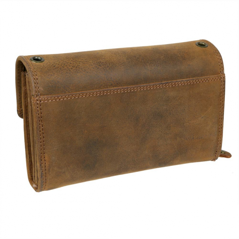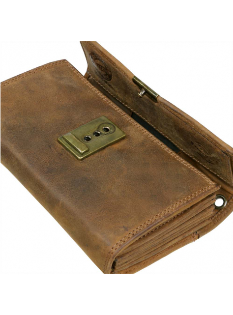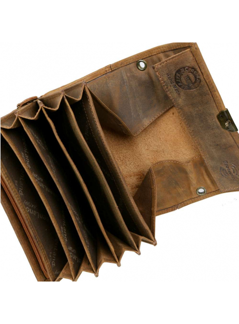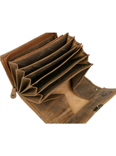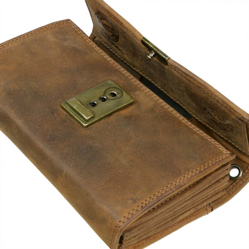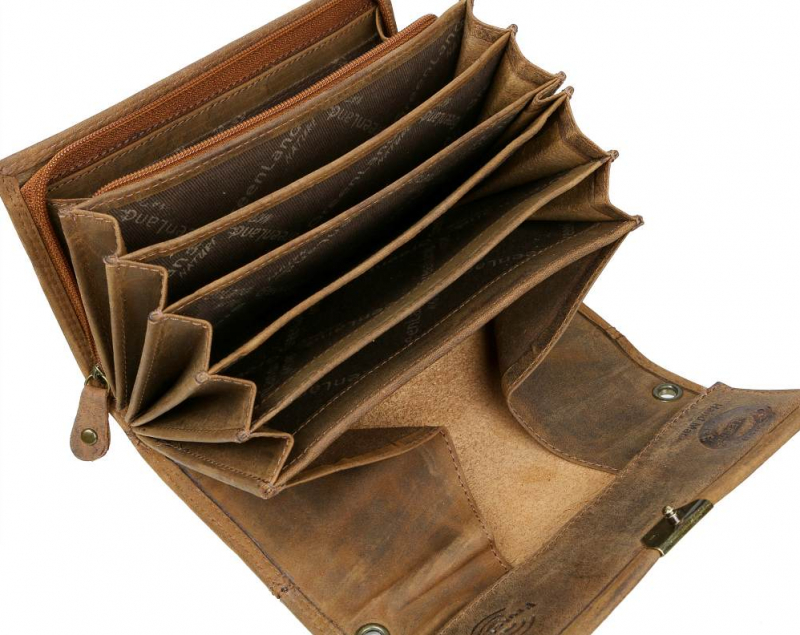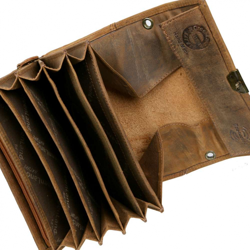 Vyrobená z kvalitnej pevnej kože so starožitným vzhľadom - patinou kože a kovového zámku. Obsahuje 5 priečinkov pre bankovky, na mince je možné využiť široký viedenský mincovník a v prednej časti zipsový mincovník v ktorom sú 3 kartové a 2 ďalšie ploché priehradky. Uzatváranie na kovový patent s troma polohami. Veľký typ peňaženky v masívnom prevedení z kvalitnej hovädzej kože v brúsenej vintage úprave..