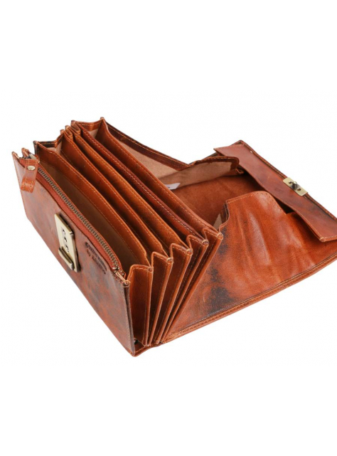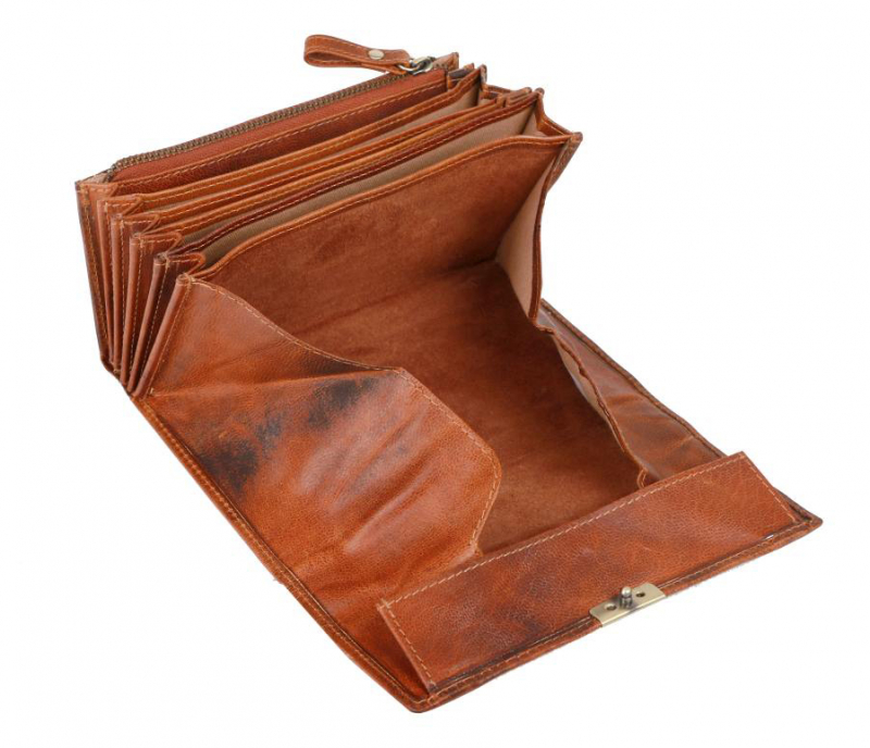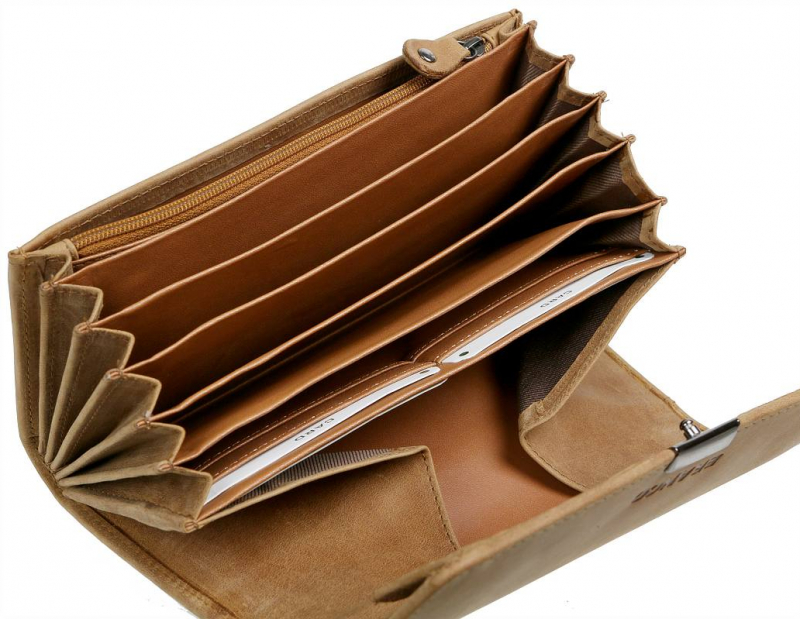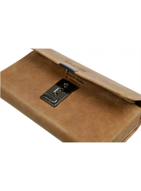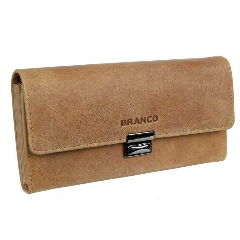 Čašnícka peňaženka značky BRANCO z kvalitnej pravej kože v naturálnej hnedej farbe. Elegantné spevnené prevednie. Všetky steny vrátane dna francúzskeho mincovníka sú vystlané koženkou. Uzatváranie na kovový patent s 3 voliteľnými zapínaniami, široké vejárové otváranie.