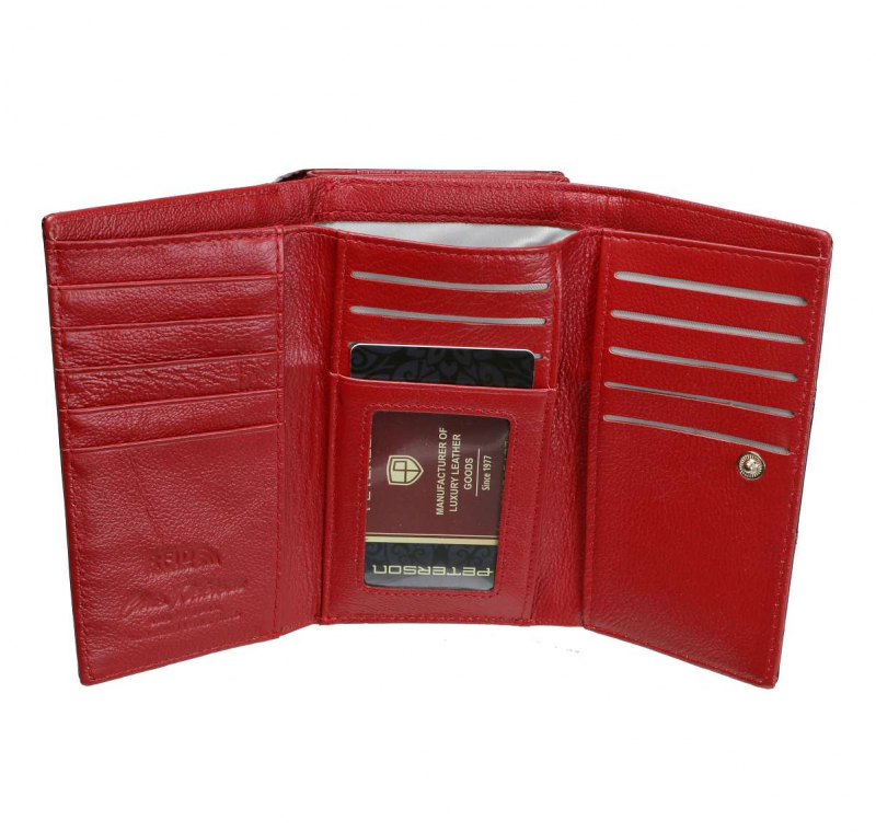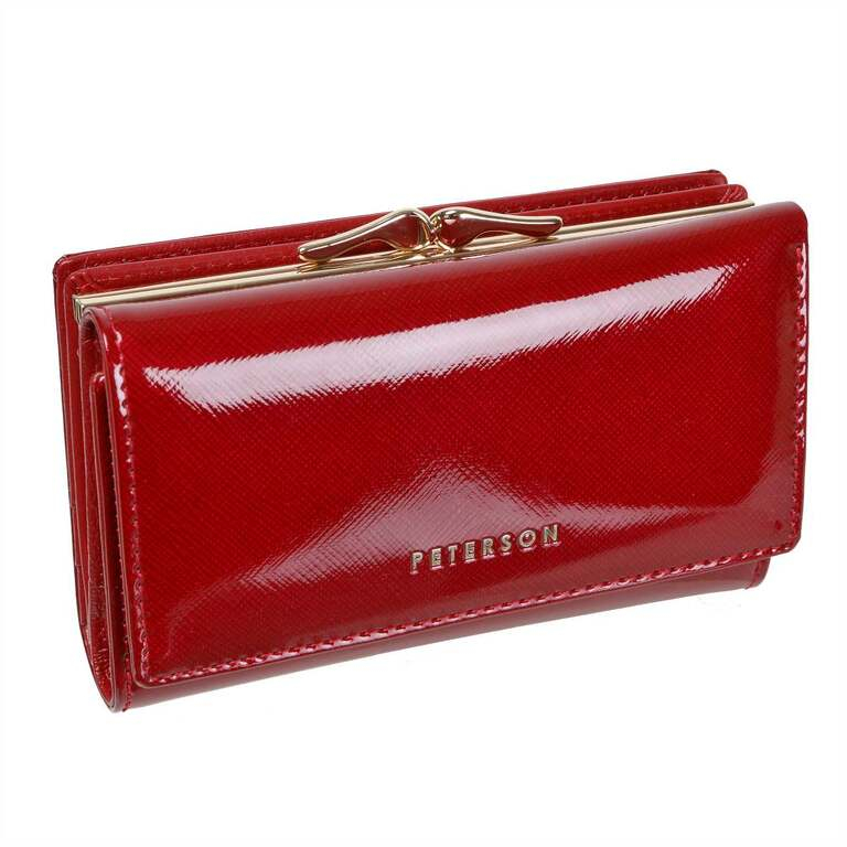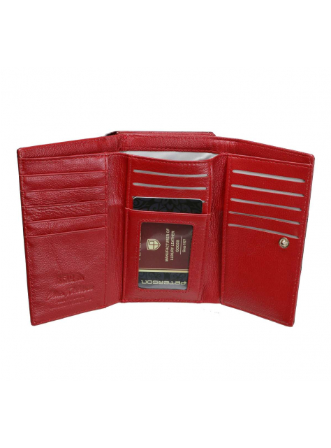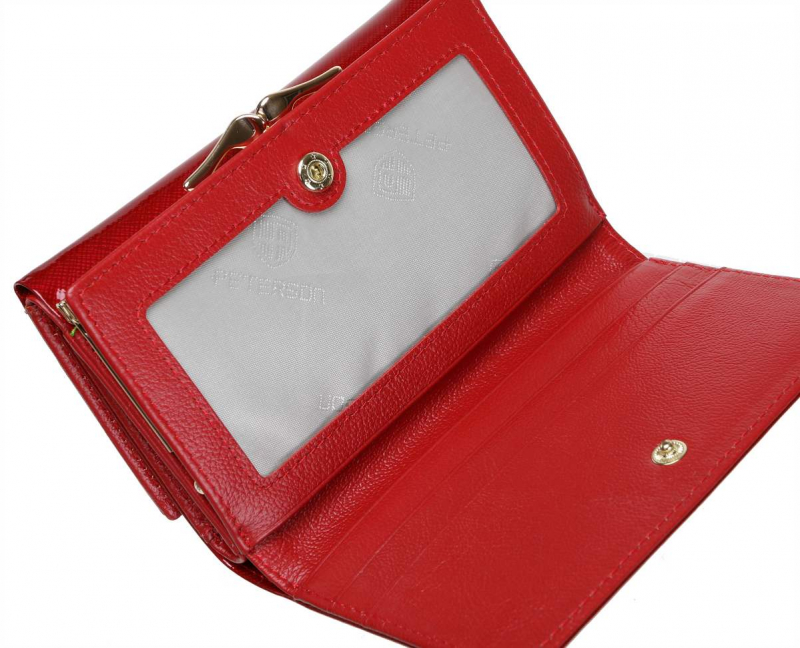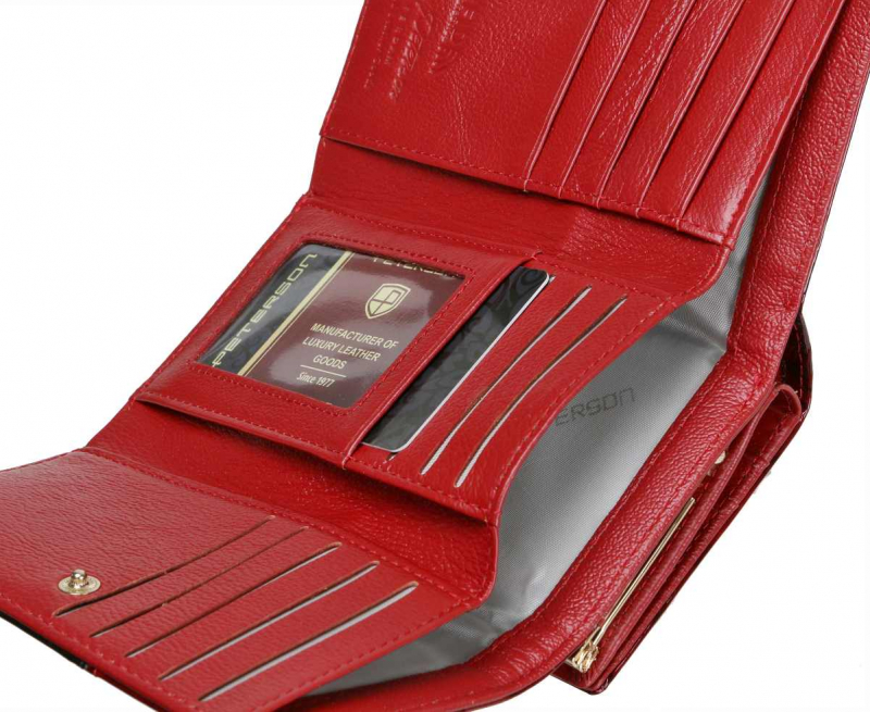 Exkluzívna kožená peňaženka zn. PETERSON v červenej karmínovej farbe - s troma samostatnými časťami - mincovník v elegantnom kovovom ráme. Vybavená RFID ochranou kariet.