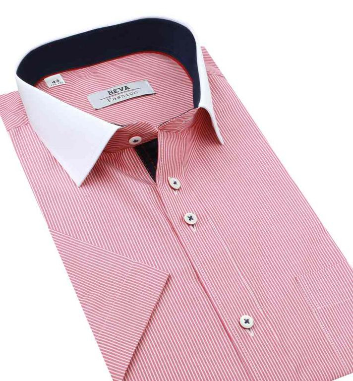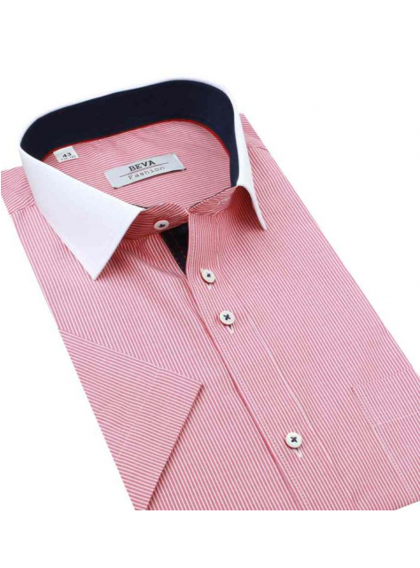 Pánska košeľa s bielym golierom s podšitím BEVA FASHION. Prúžkovaná košeľa klasického strihu na výšku postavy 176 - 182 cm s krátkym rukávom.