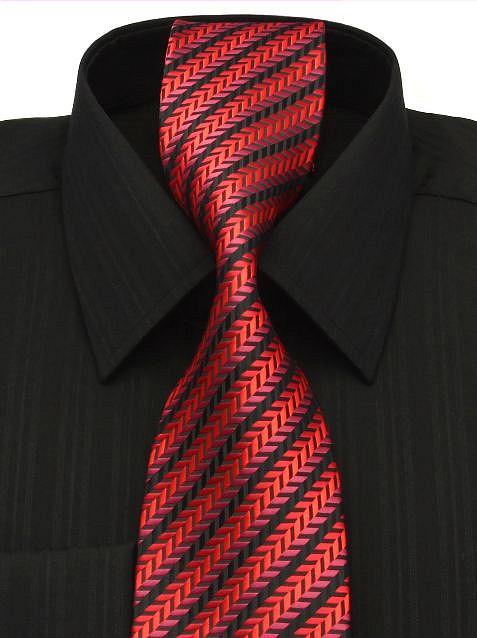 Zaujímavo vytkávaný vzor - 3 rôzne odtiene červenej a čierna. Kravata vynikne okrem bielej košele na červených, čiernych, šedých a rôznych bordových košeliach.