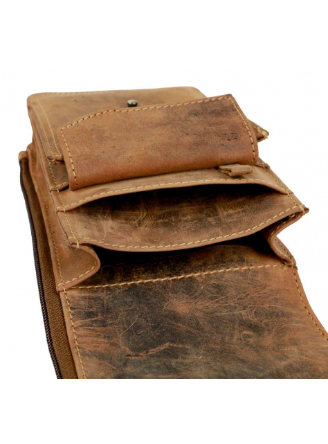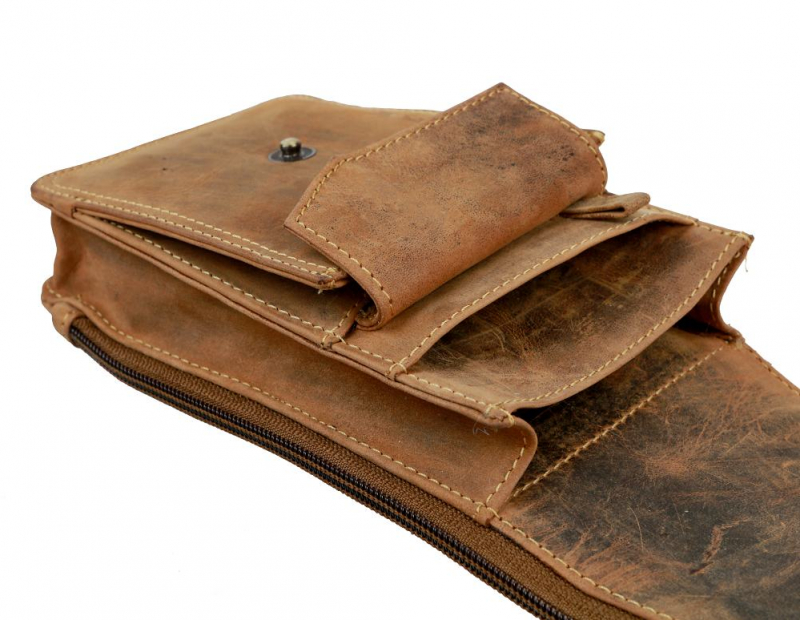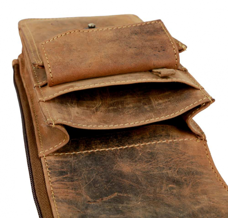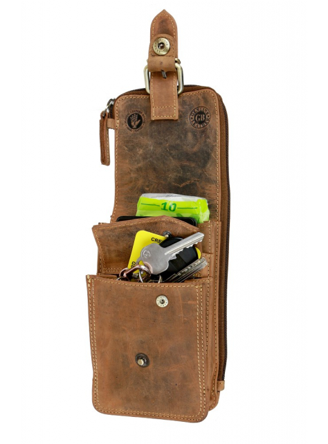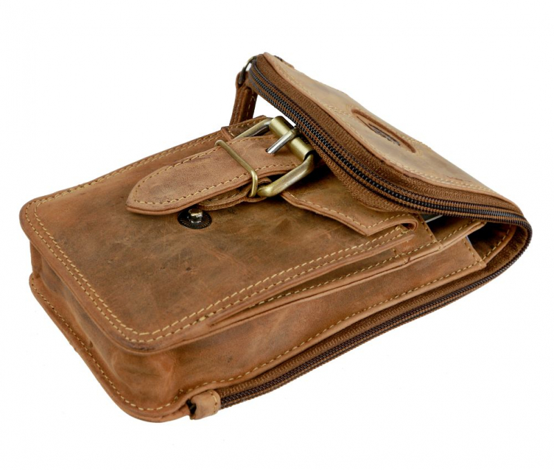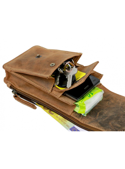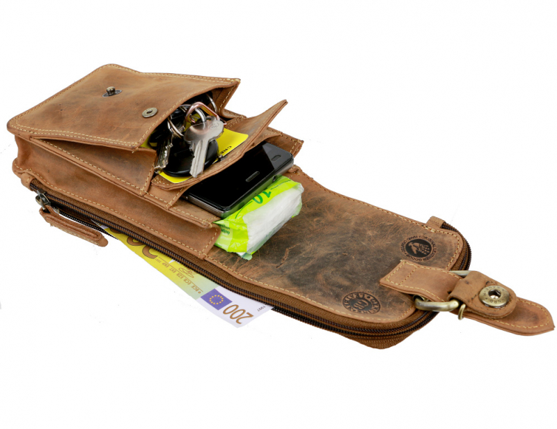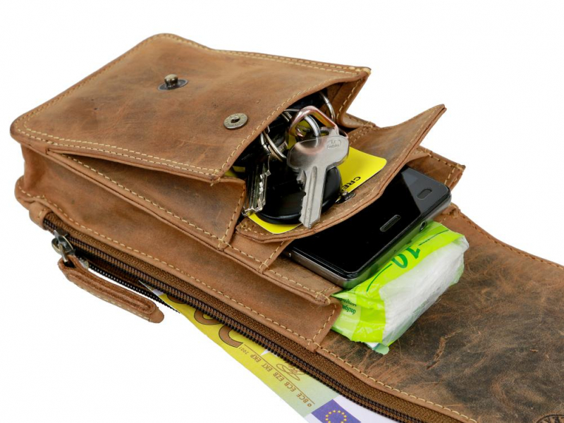Taštička vhodná pre menšie predmety - kľúče, smartfón, peňaženka a pod. XL oddelenie uzatvárané na zips vyhovuje bankovkám do 1000€. Kožené pútka na zadnej strane pre opasok šírky do 5,5 cm.