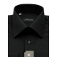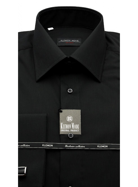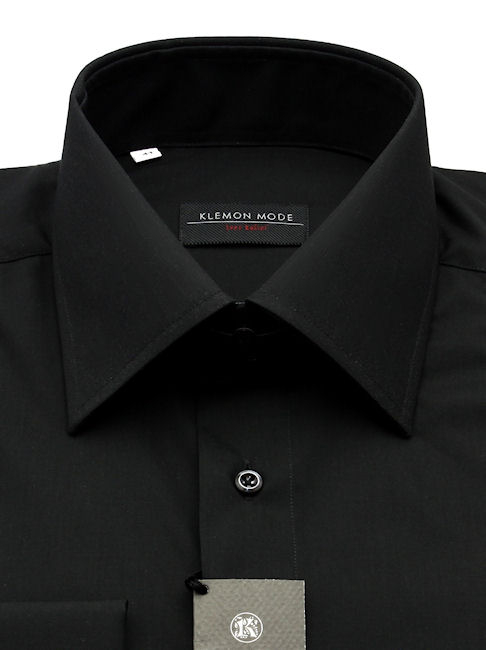 Košeľa na manžetové gombíky s vysokým golierom z hladkej čiernej tkaniny. Vhodná na bežné nosenie aj na spoločenské príležitosti.