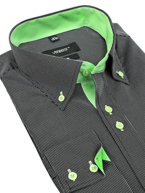 - dvojitý golier s prepínacími špičkami, mierne vystužený, zelené podšitie goliera a manžiet, zelený vnútorný stojačik,