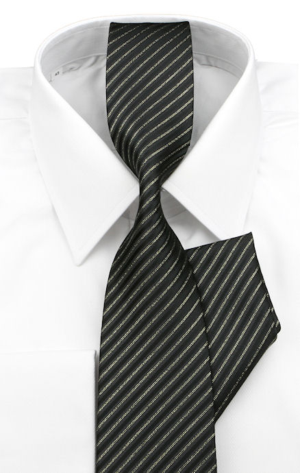 Pánska spoločenská súprava viazanka a vreckovka do saka v čiernej elegantnej kombinácii so zlatistými prúžkami.