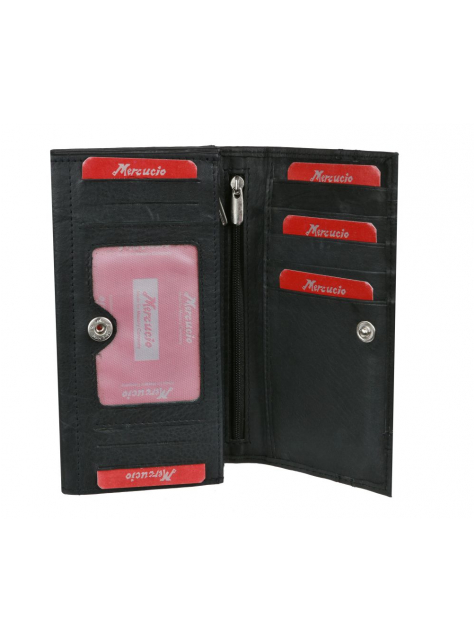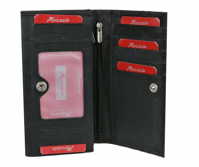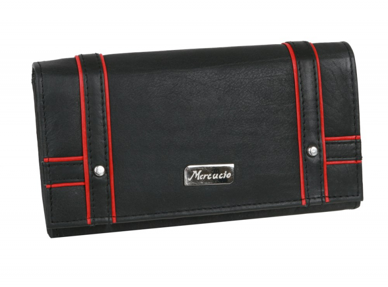 Dámska peňaženka MERCUCIO s veľkými vnútornými priehradkami z príjemne mäkkej a hebkej kože. Priestranný listový formát dostupný v čiernej farbe s červeným detailom.