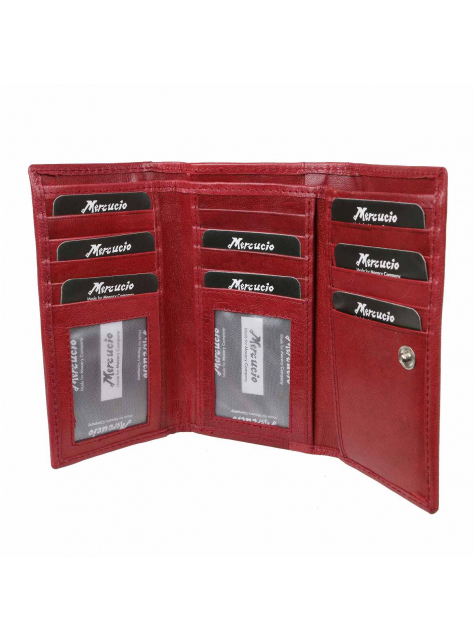 Dámska kožená peňaženka MERCUCIO strednej veľkosti 14,5 x 9 cm. Peňaženka má vonkajší priestranný mincovník a 2 veľké priehradky na bankovky. Vyhovuje aj dokladom staršieho formátu.