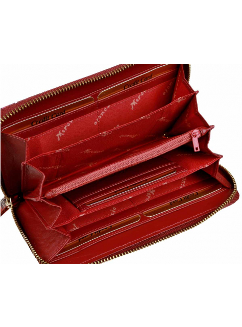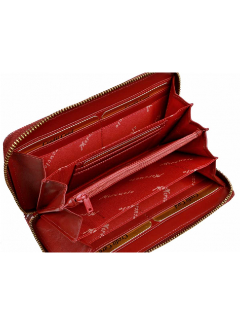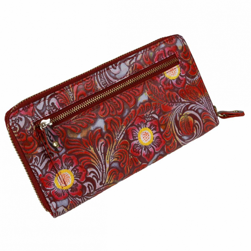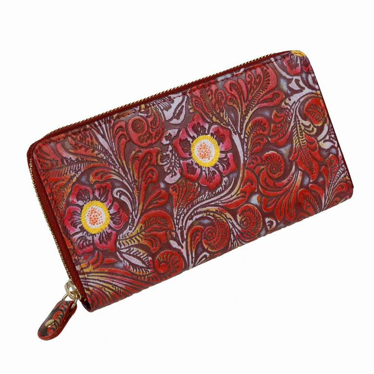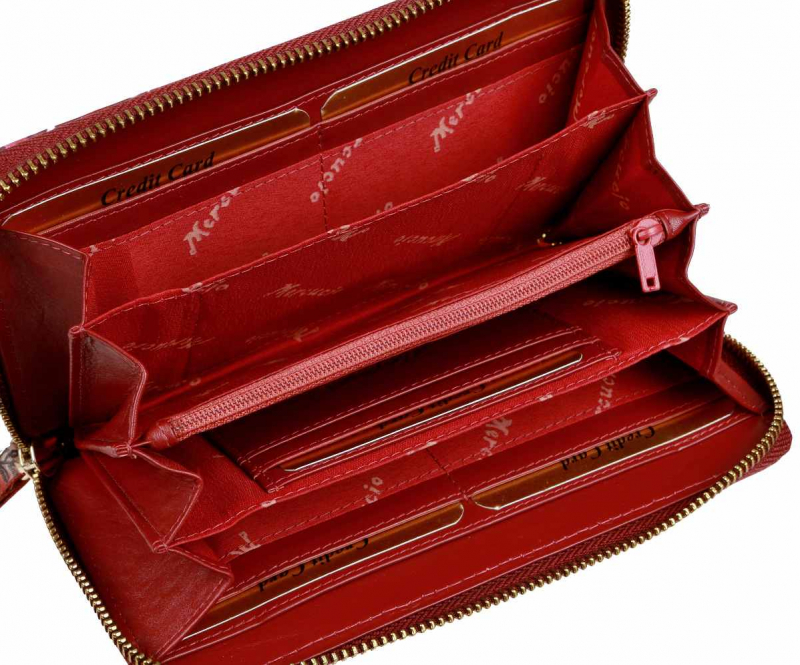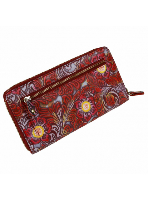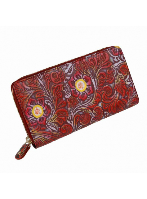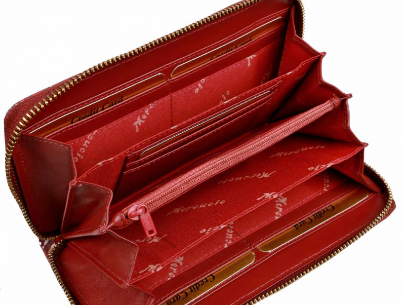 Exkluzívna dámska peňaženka MERCUCIO červenej farby s elegantnou brúsenou potlačou kvetov. Vejárovité otváranie, uzatváranie zipsom YKK v zlatej farbe.