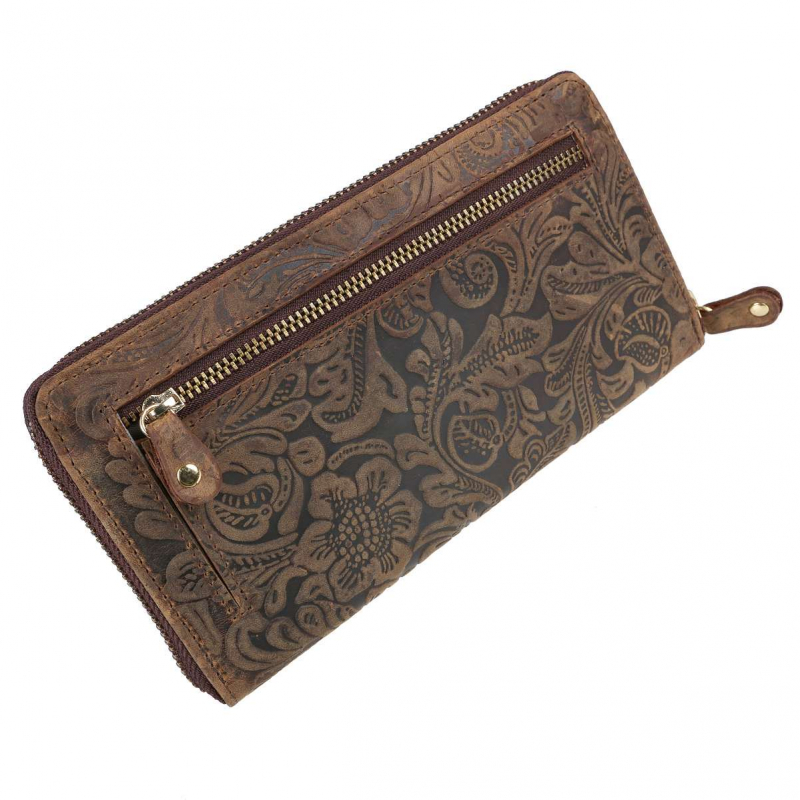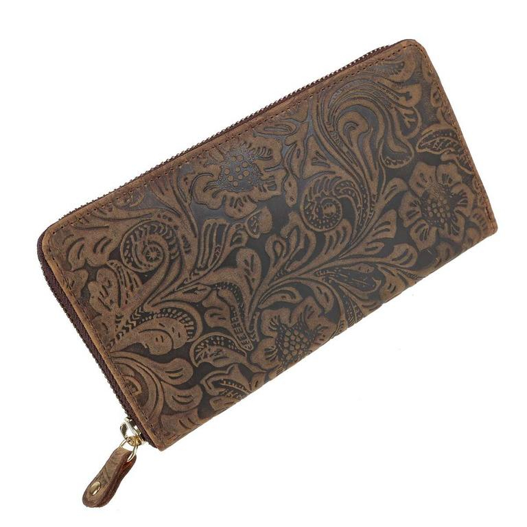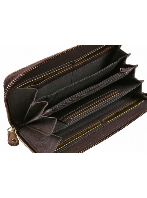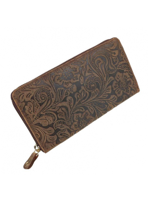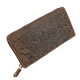 Elegantná dámska peňaženka MERCUCIO hnedej farby. Listová peňaženka s elegantnou brúsenou potlačou kvetov. Vejárovité otváranie, uzatváranie zipsom v zlatej farbe.