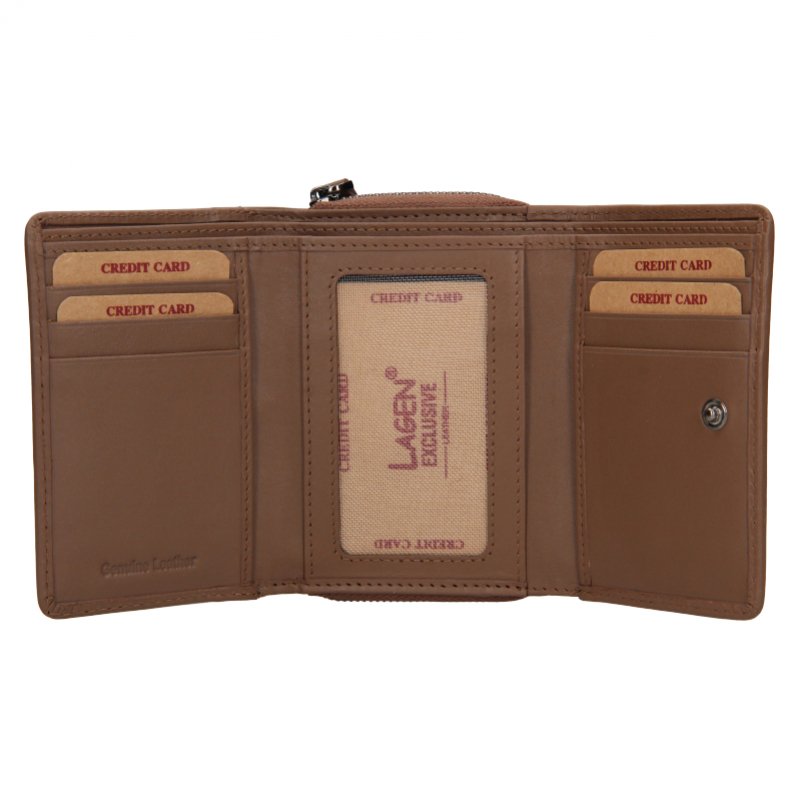 Malá dámska kožená peňaženka LAGEN v luxusnom vysoko elegantnom prevedení. Malý praktický formát do dlane, poskytuje dostatok priestoru pre mince, bankovky, karty aj doklady.