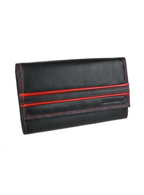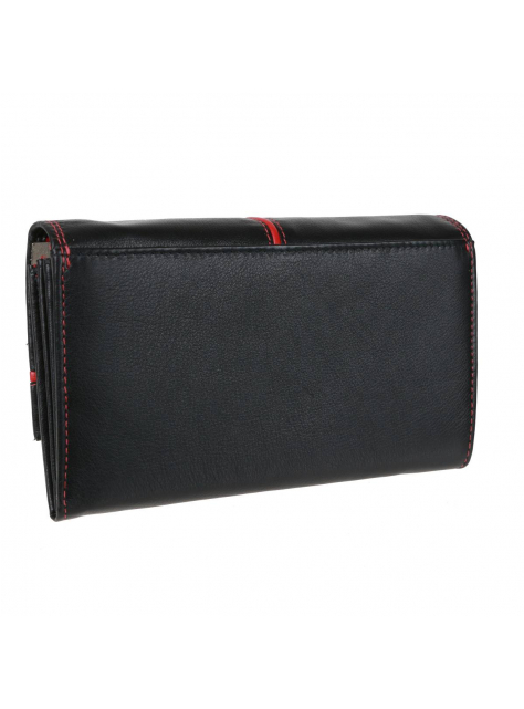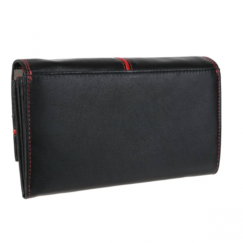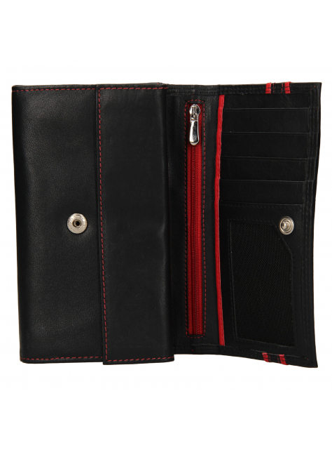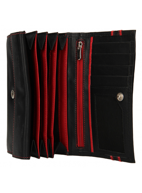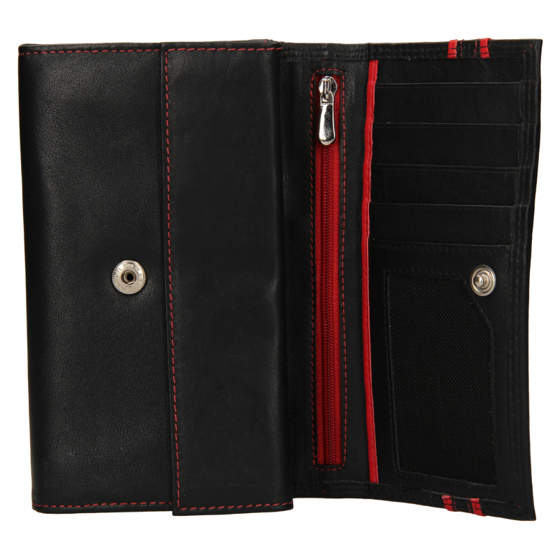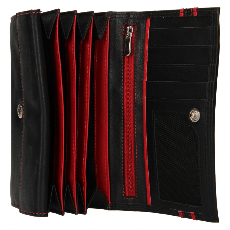 Kvalitná a luxusne spracovaná koža v čierno-červenej úprave s hladkou prírodzene vráščitou kresbou. Zapínanie na patent. Veľký mincovník s poklopom a veľká stredová priehradka na zips pre väčšiu bezpečnosť dokumentov alebo bankoviek. V peňaženke je možné umiestniť aj väčšie staršie typy osobných dokladov (vrátane VP).