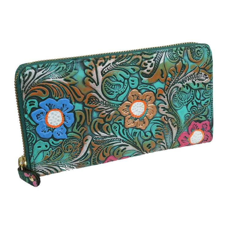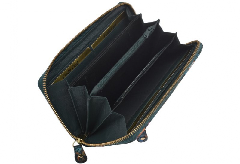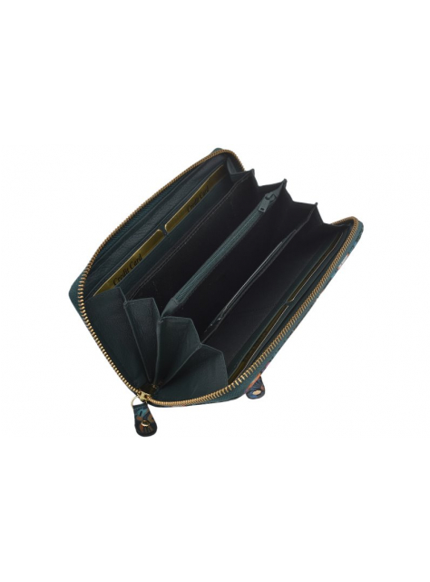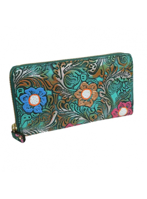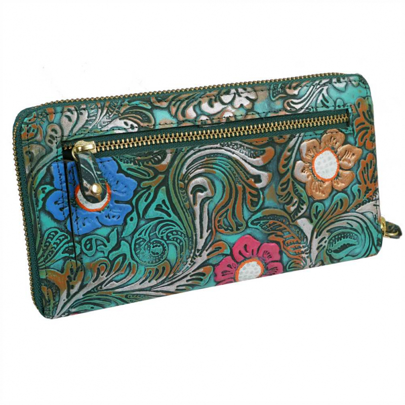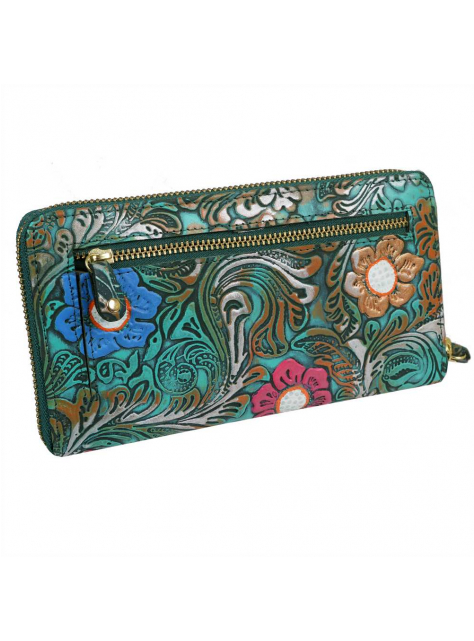 Exkluzívna dámska peňaženka MERCUCIO s maľovaným hlboko razenou potlačou kvetín. Vejárovité otváranie, uzatváranie zipsom YKK v zlatej farbe.