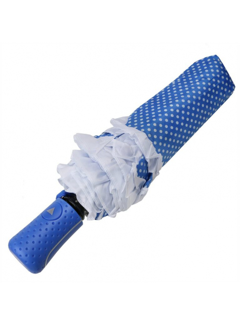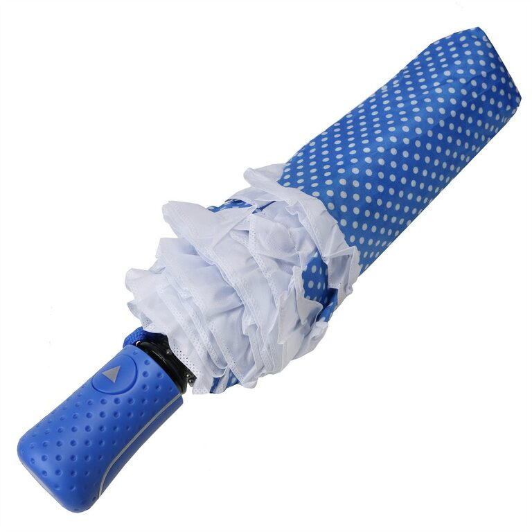 Kvalitný dámsky poloautomatický - vystreľovací dáždnik značky. Elegantné prevedenie dáždnika s plátnom z kvalitného rýchloschnúceho polyesteru s odolnosťou voči vode a s rýchlym schnutím v jemnejšom modrom odtieni modrej nebeskej. Komfortná ergonomicky prispôsobená rukoväť z pogumovaného plastu v modro striebornej farebnej kombinácii.