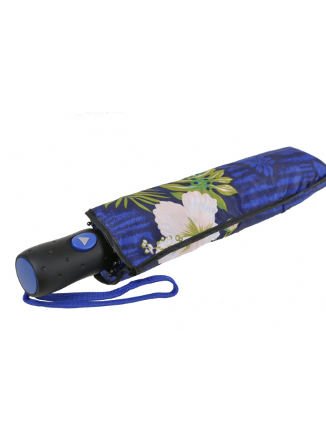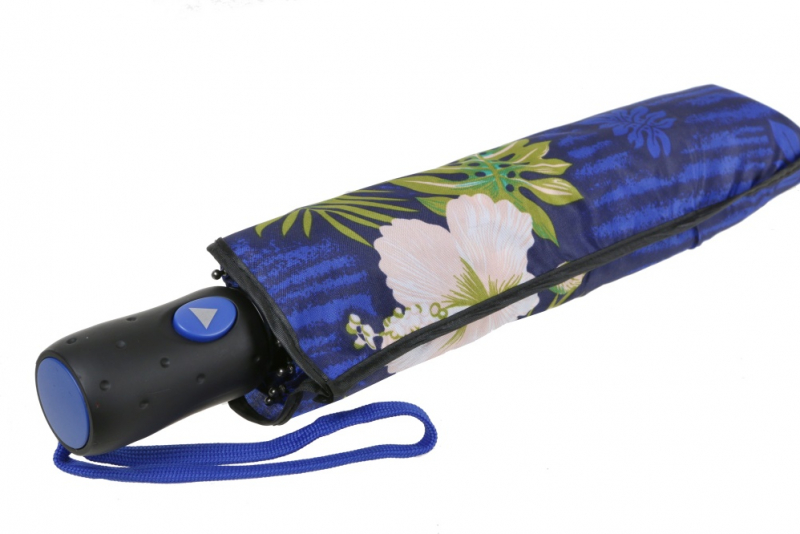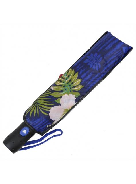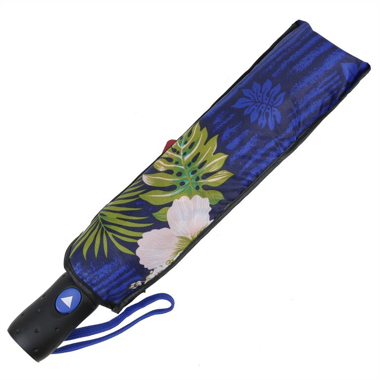 Kvalitný dámsky poloautomatický - vystreľovací dáždnik značky Eső Fecske®. Elegantné prevedenie dáždnika s plátnom z kvalitného rýchloschnúceho polyesteru s odolnosťou voči vode a s rýchlym schnutím vo farbe modrá parížska s ľaliami v jemnej lososovej a bielej farbe. Komfortná ergonomicky prispôsobená rukoväť z pogumovaného plastu v modro čiernej farebnej kombinácii.