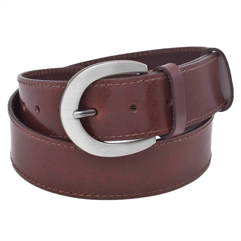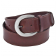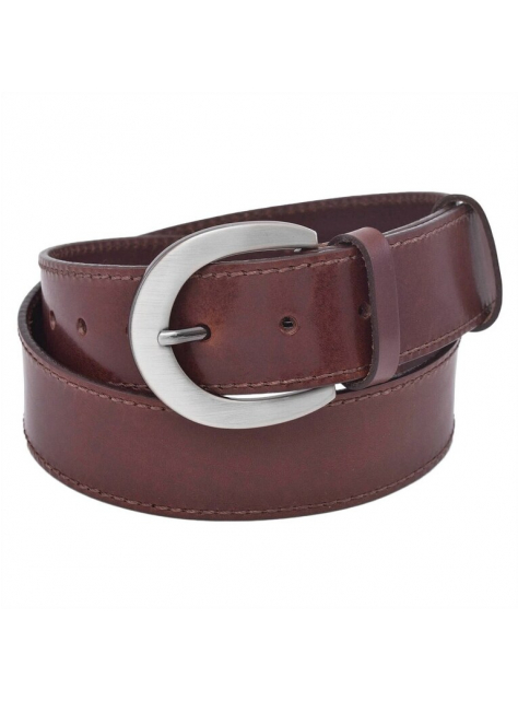 Tmavohnedý dámsky kožený opasok v atraktívnom prevedení - so zaoblenou satinovanou prackou, remeň v elegantnej hladkej gaštanovo-hnedej úprave so štepovaním.