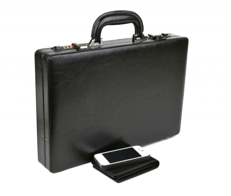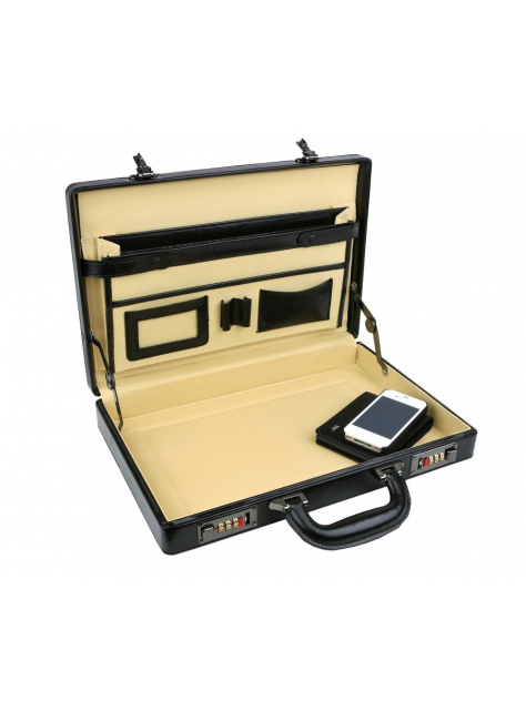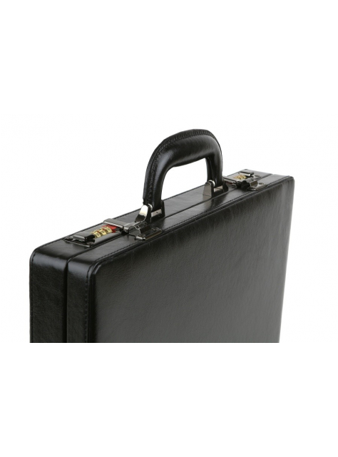Koženkový kufrík s nastaviteľným kódovacím mechanizmom. Elegantné kovanie - čierno-šedý leštený kov. Stabilitu zabezpečujú 4 kovové nôžky.