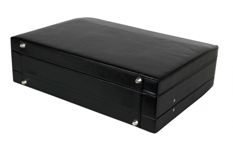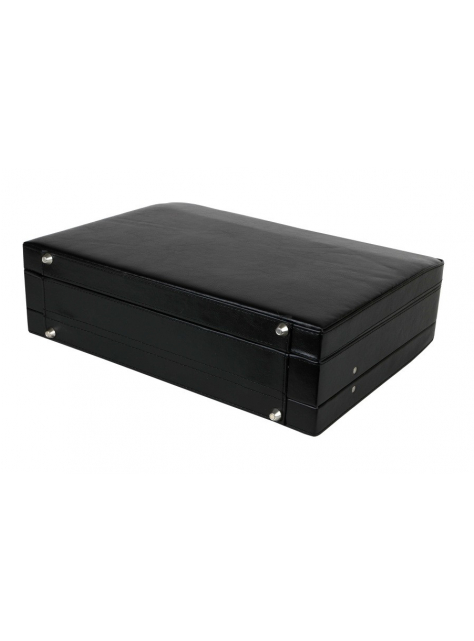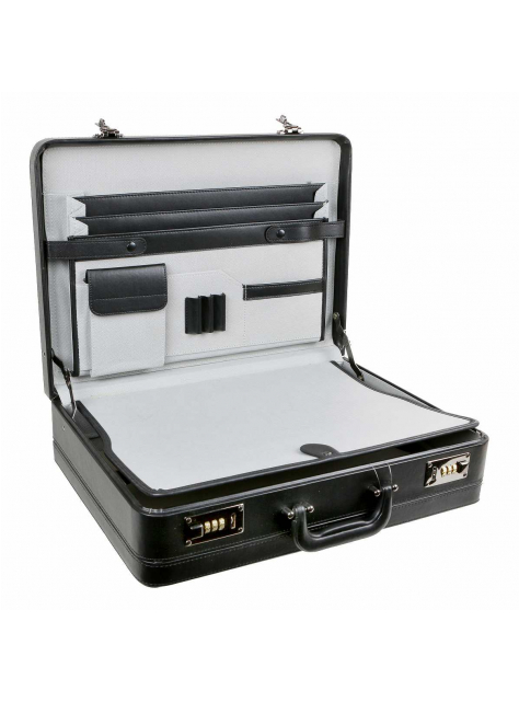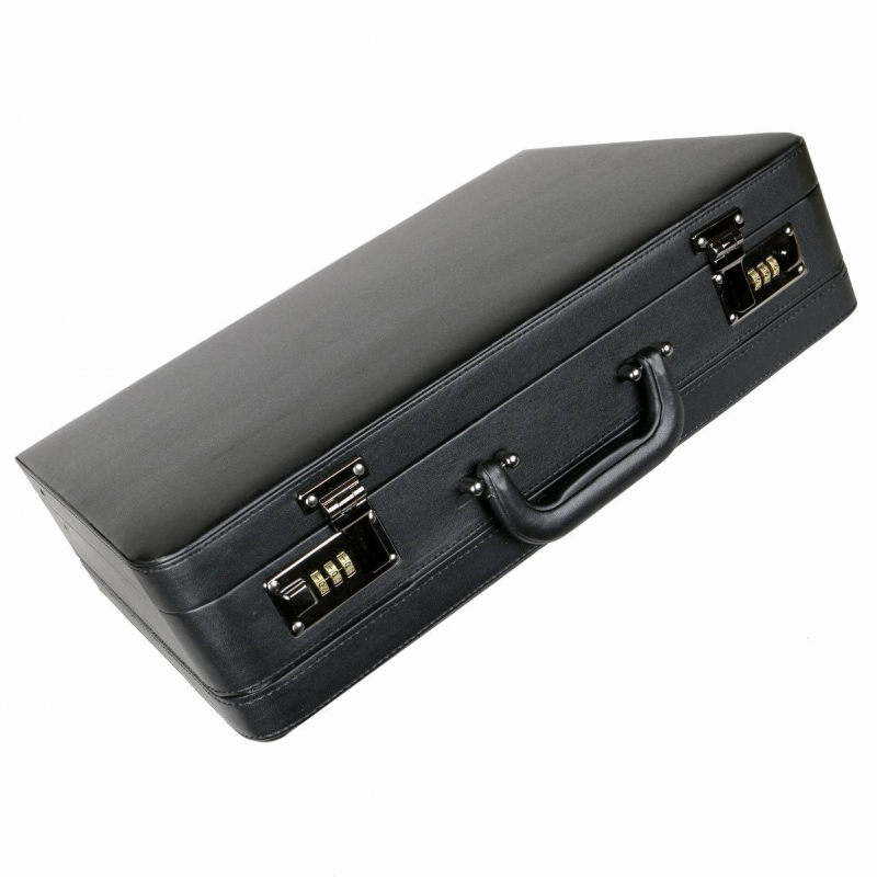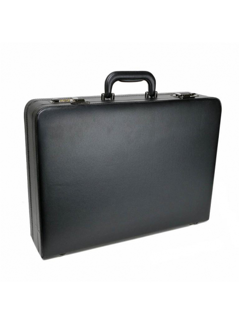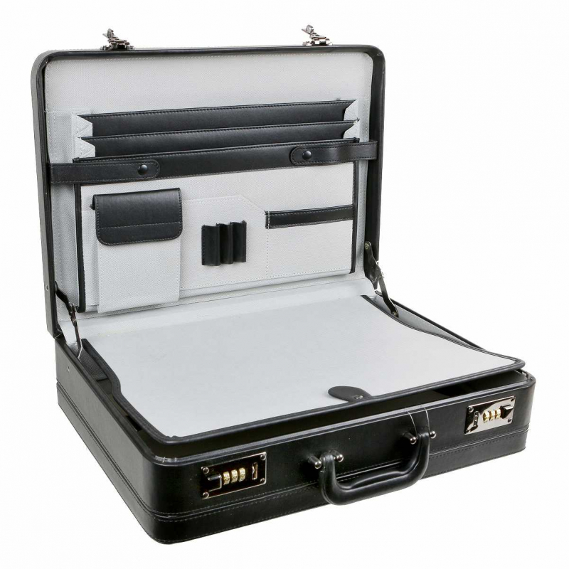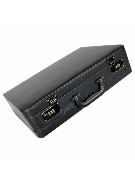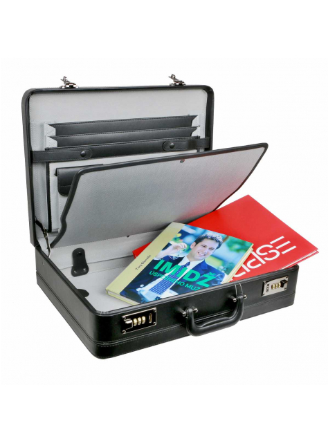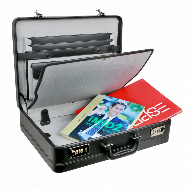 Koženkový diplomatický kufrík v čiernom prevedení značky DN. Uzatváranie nastaviteľným kódovacím zámkom. Vnútorný úložný priestor s možnosťou rozšírenia o 2 cm (odopnutím praciek). Úchop za rukoväť (spevnená, ergonomicky tvarovaná). Státie na 4 kovových podstavcoch.