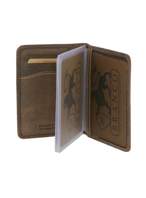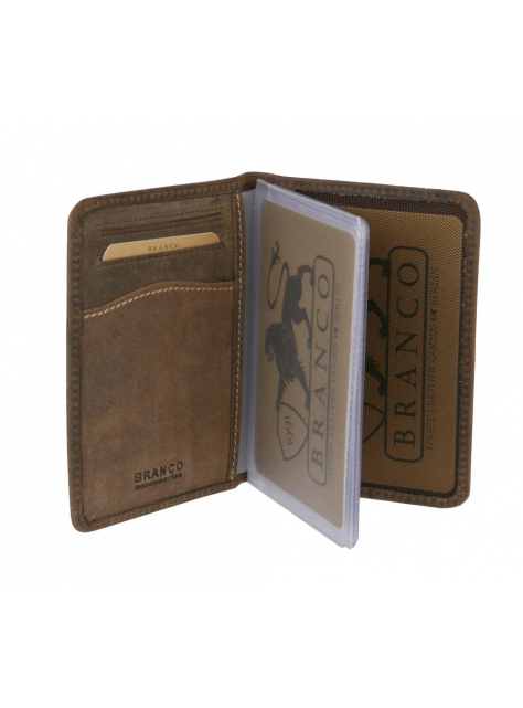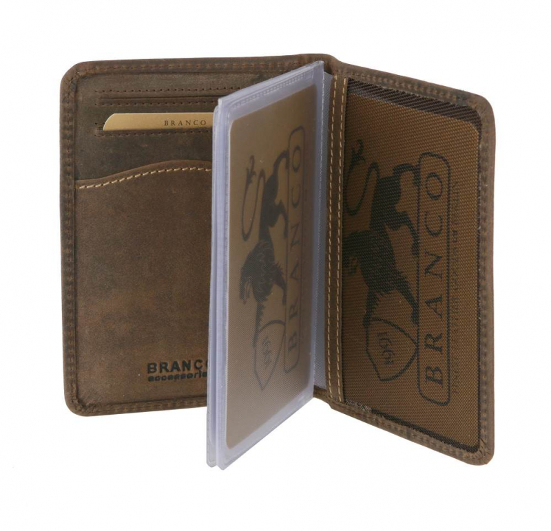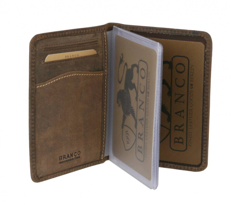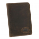 Dokladovka a puzdro na karty z brúsenej mramorovanej kože v tmavohnedej farbe. Pevná úprava s okrajovým prešívaním. Vyhovujúca aj staršiemu - väčšiemu typu osobných dokladov
