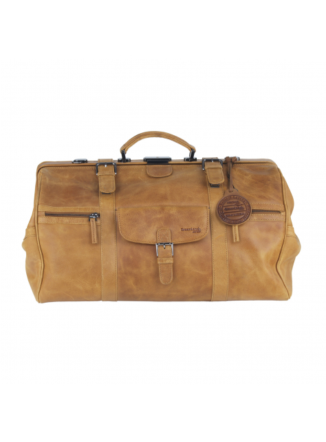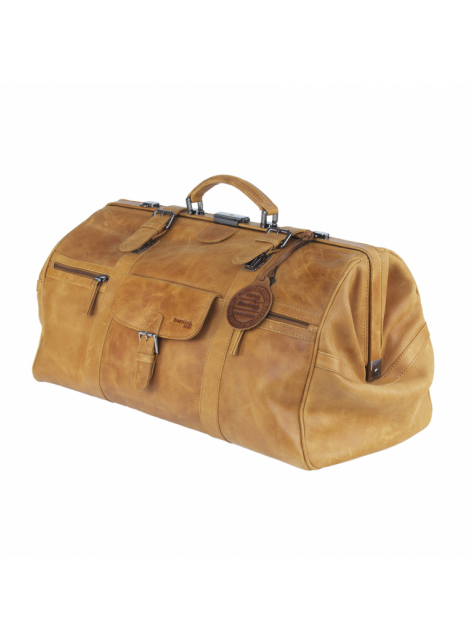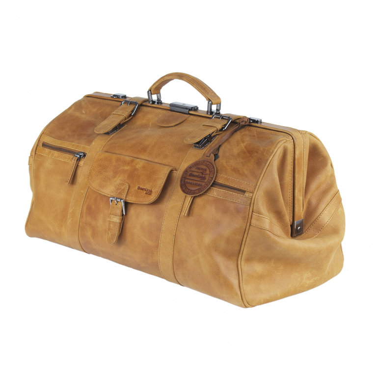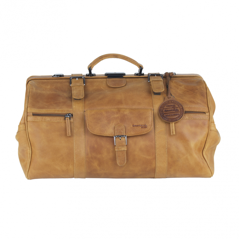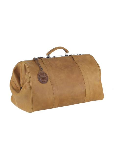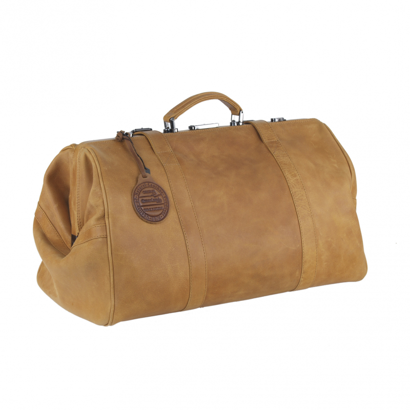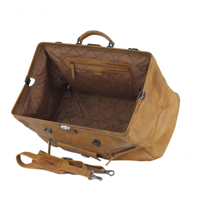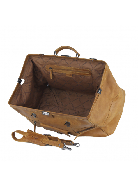 Cestovný kožený "lekársky" kufrík s veľkým úložným priestorom vo koňakovo-hnedej farbe kože.