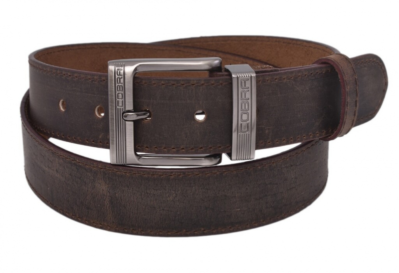 Kožený unisex opasok so štýlovou prackou COBRA . Remeň tmavohnedej farby s okrajovým štepovaním, masívna koža v brúsenej rustikálnej úprave.
