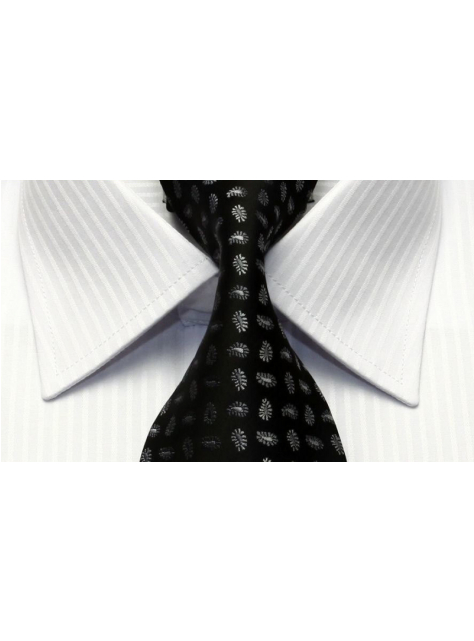 Pánska spoločenská košeľa so krytou gombíkovou légou a manžetami na manžetové gombíky. Košeľa v klasickom voľnom strihu, na výšku postavy 176 - 182 cm, rukáv 66 cm (pre veľkosti 45/46). Elegantná snehobiela tkanina s tkanými prúžkami.