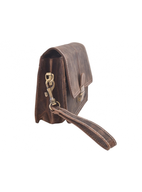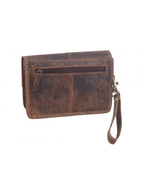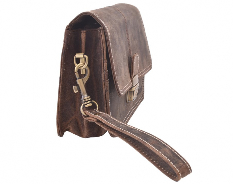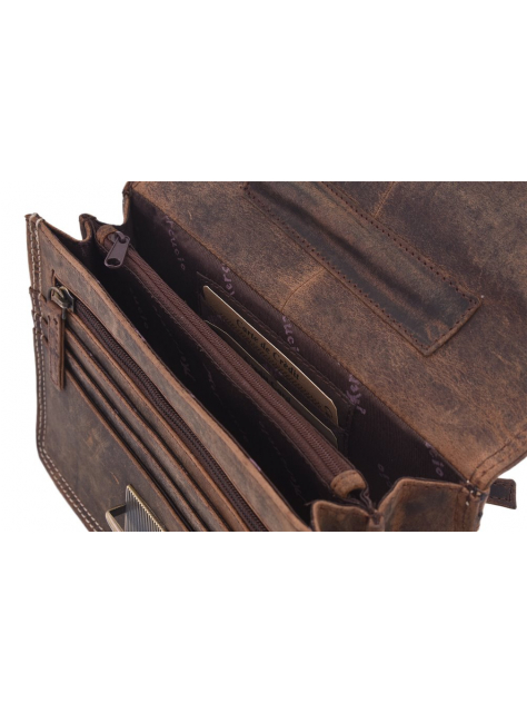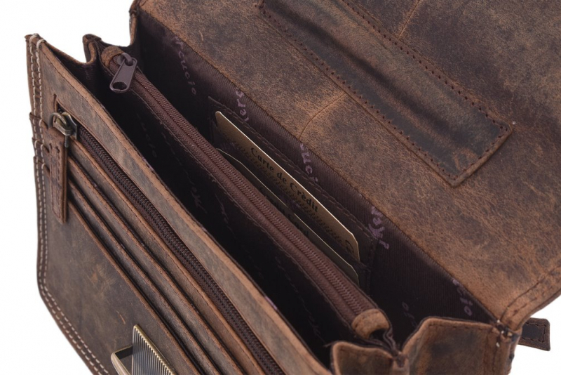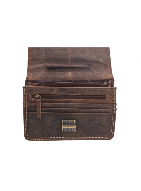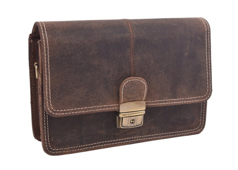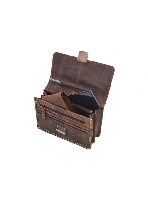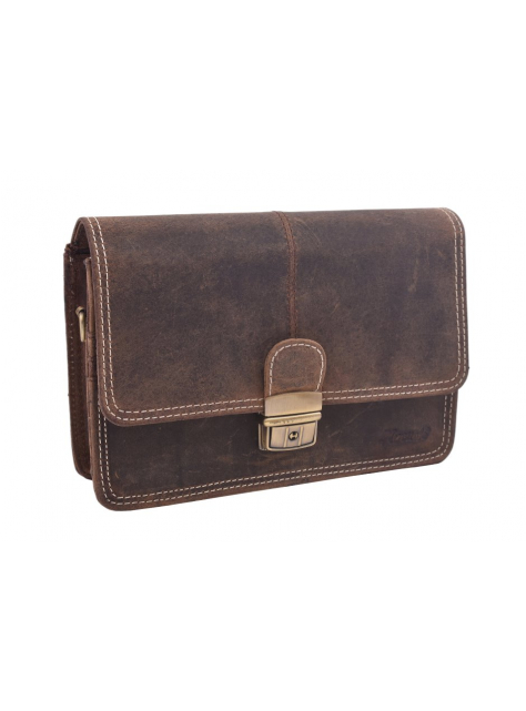 Pánska kožená príručná taška väčšieho typu s viacerými vnútornými priehradkami. Masívna koža v hladko-vybrúsenej povrchovej úprave, hnedé mramorované prevedenie. Nosenie za rúčku - pripnutím na karabínku na bočnej strane. Zapínanie na kovovú zliatinovú pracku. Každý kus tašky je originálny povrchovým sfarbením a mramorovaním.