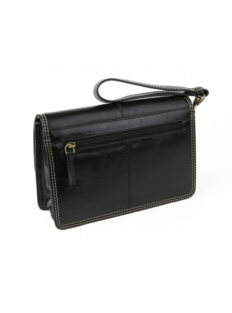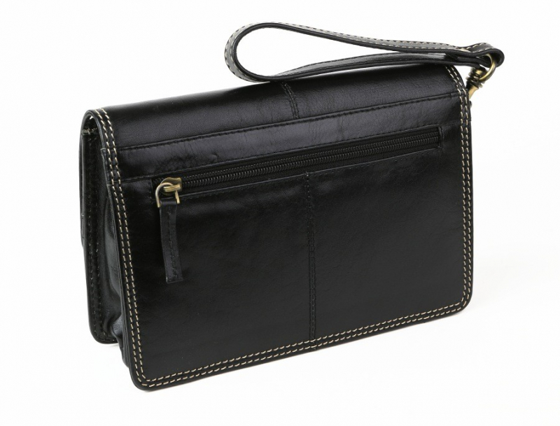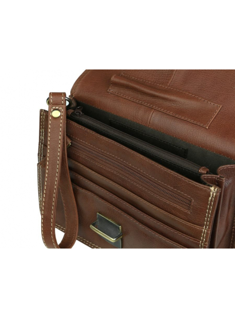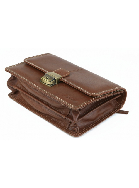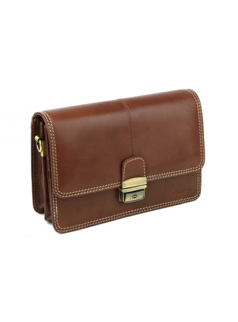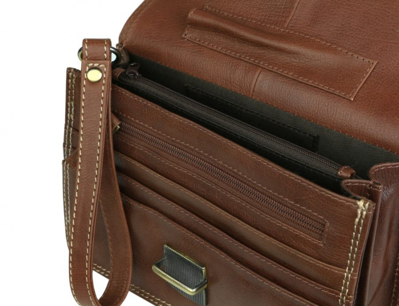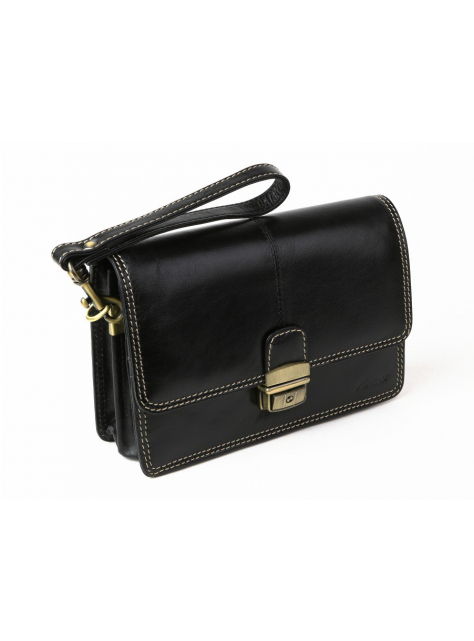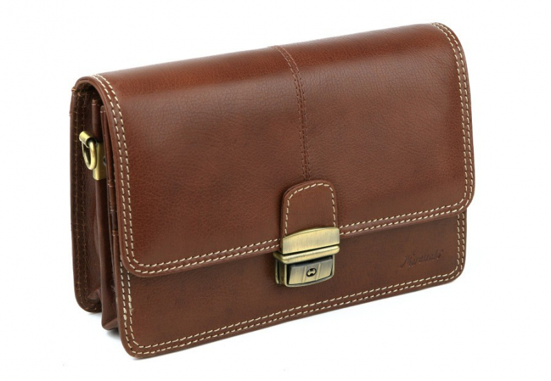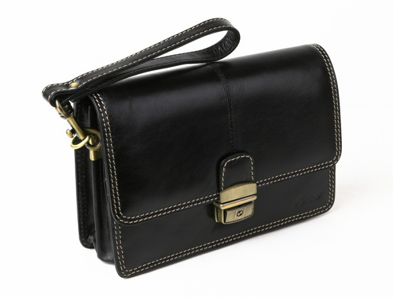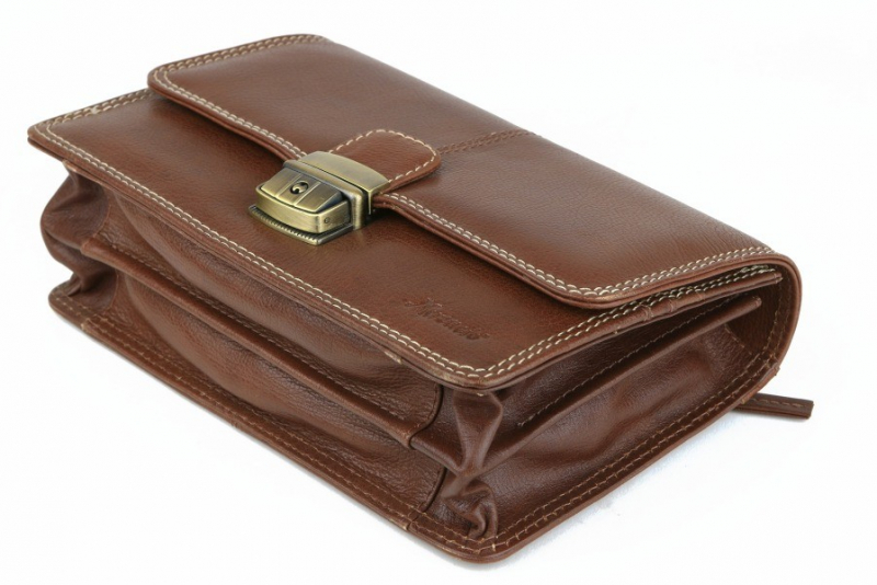 Príručná pánska taška v športovo-elegantnom štýle. Úchop do ruky alebo za odnímateľnú koženú rúčku. Zapínanie na kovovú pracku, kov matný, zlato-šedý (satinovaný, jemne matný s patinou).