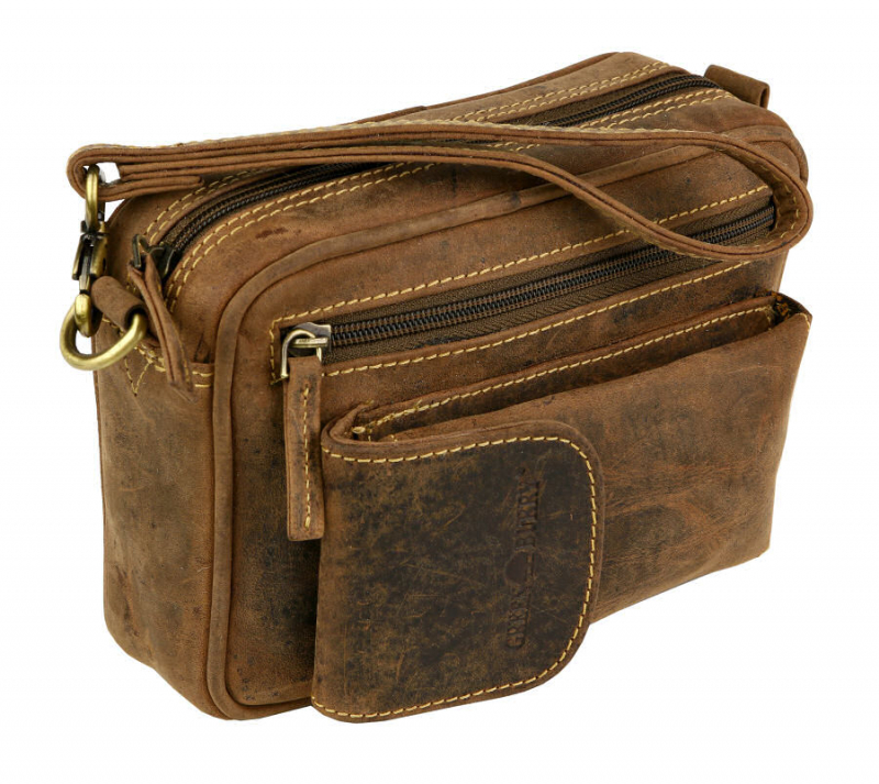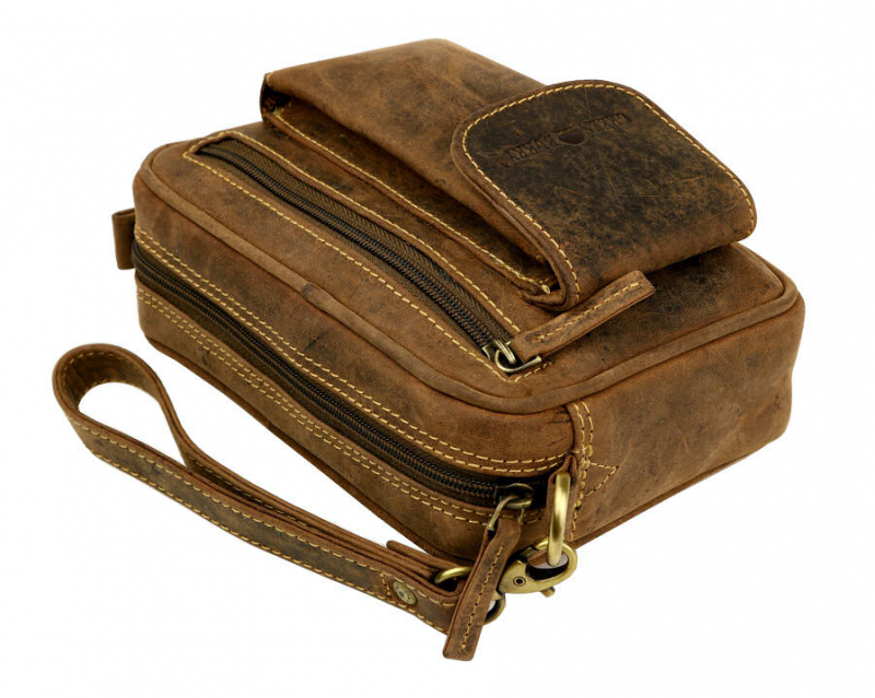 Pánska príručná taška GreenBurry s bočnou rúčkou v športovo-elegantnom štýle. Koža spracovaná brúsením s hladkým povrchom v úprave Vintage antic braun (tmavohnedá s mramorovanými prechodmi). Ozdobné prešívanie oranžovo-hnedou niťou.