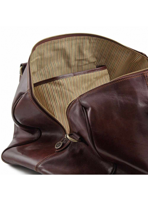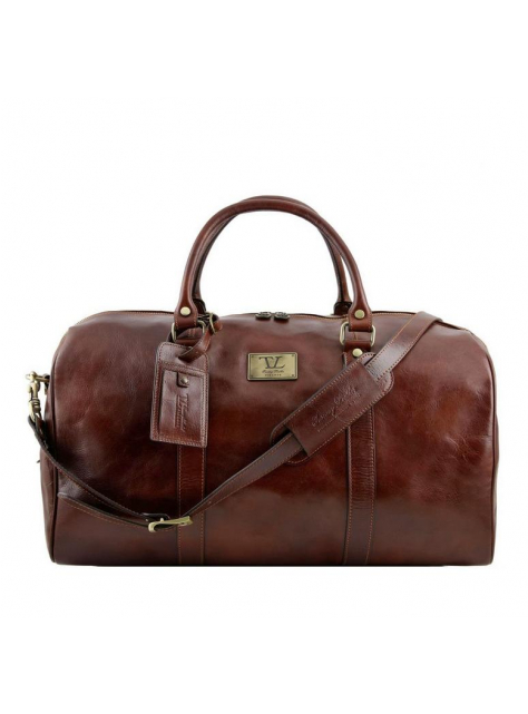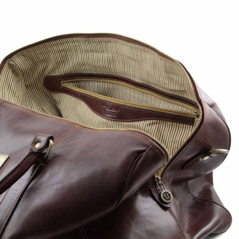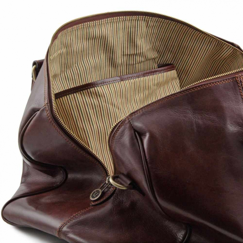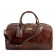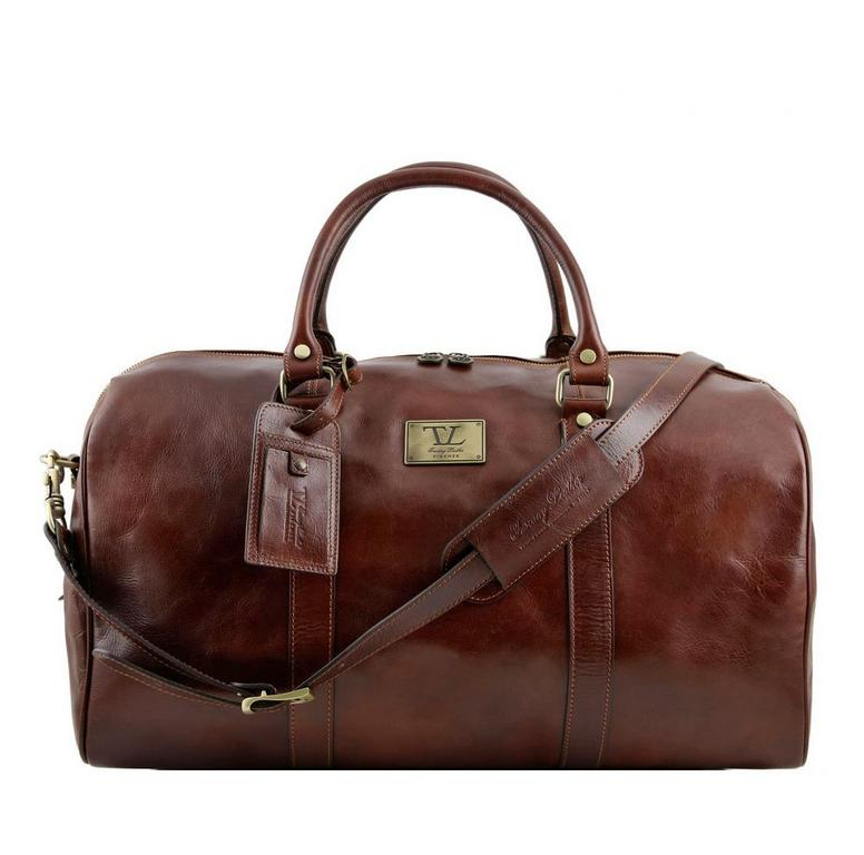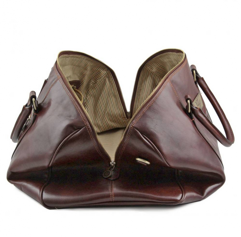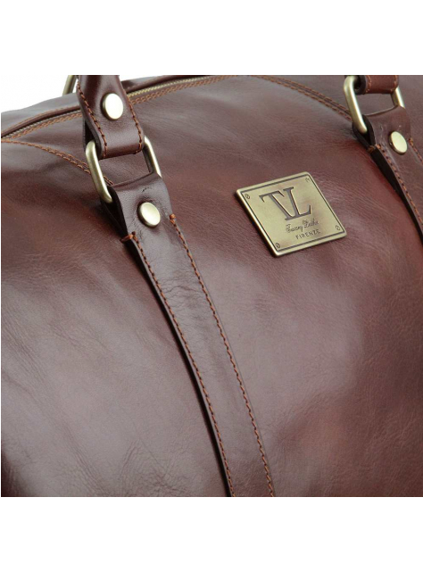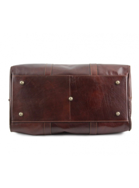 Príručná cestovná taška v hnedej farbe z kolekcie VOYAGER od TUSCANY LEATHER. Dno tašky je pred znečistením chránené 5 kovovými podstavcami.
