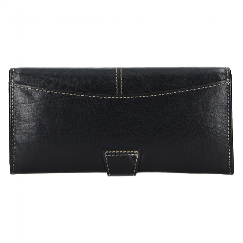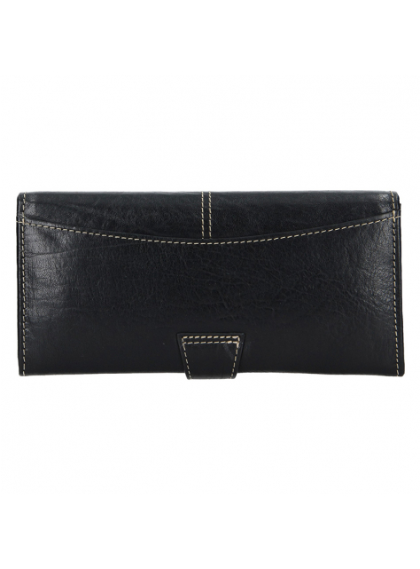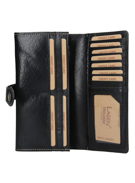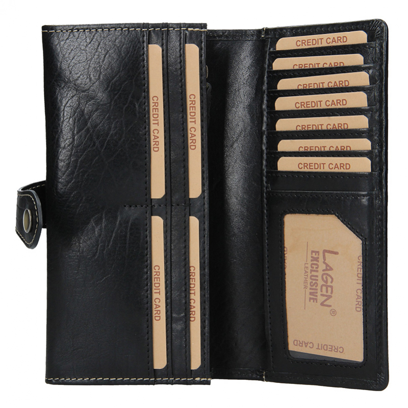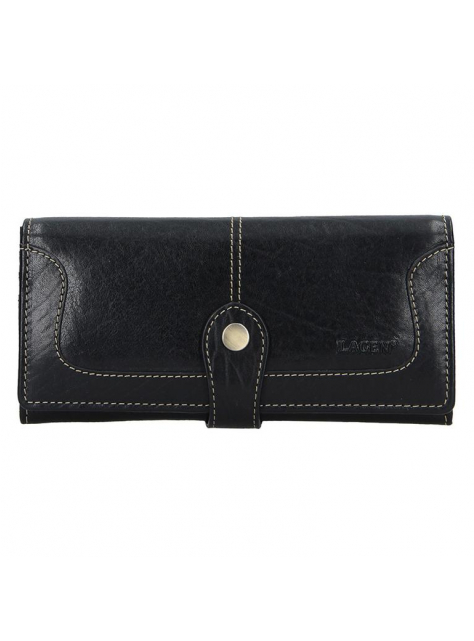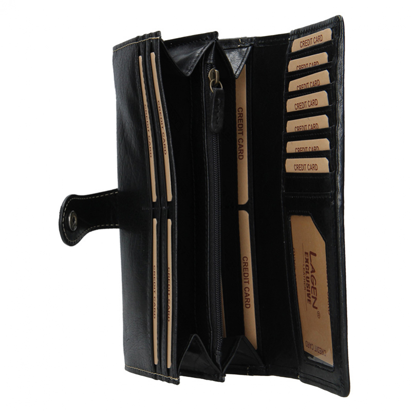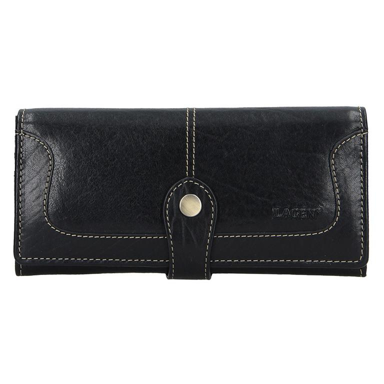 Dámska kožená peňaženka značky LAGEN. Luxusne spracovaná masívna a jemne krčená koža. Listová peňaženka s uzatváraním patentom, elegantná čierna farba, svetlejšie prešívanie.