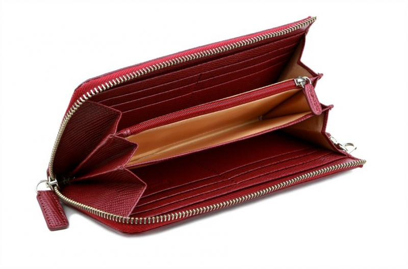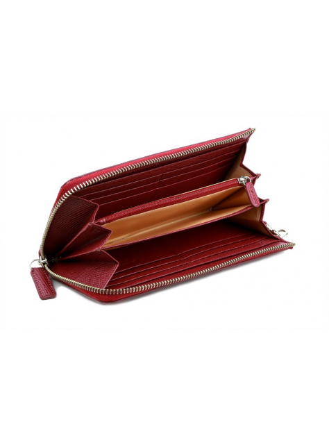 Praktický prehľadný formát pre mnoho vecí, ploché priehradky vyhovujú aj pre starší typ dokladov. Robustná koža v peknej malinovo-červenej farbe. Peňaženka obsahuje 120 kartových priehradok.