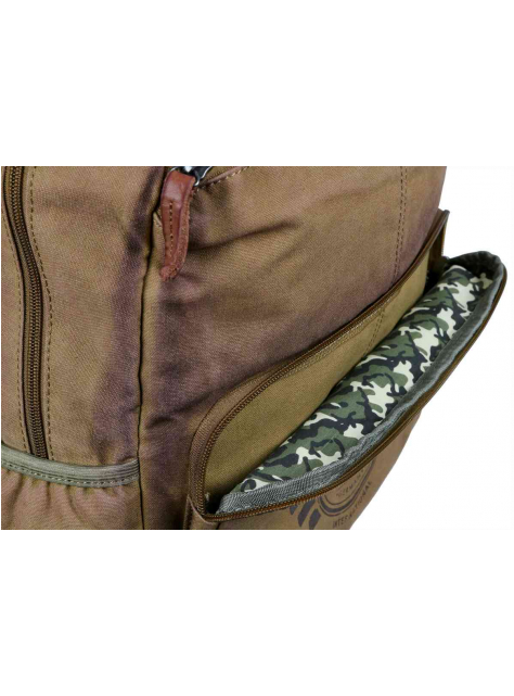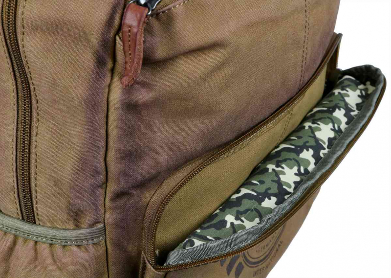 Priestranný hlavný priestor pre formáty A4 až A3, obsahuje masívne polstrovanú priehradku na notebook s uzatváraním na pracku na suchý zips. Celá zadná stena, predná stena priečinku na notebook, boky a dno s masívnym čalúnením, mierne polstrovanie väčšieho predného priečinku. Pevná bavlnená podšívka s maskáčovým vzorom.