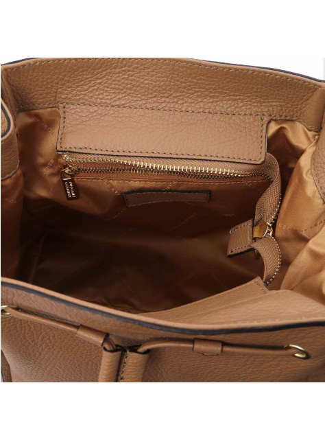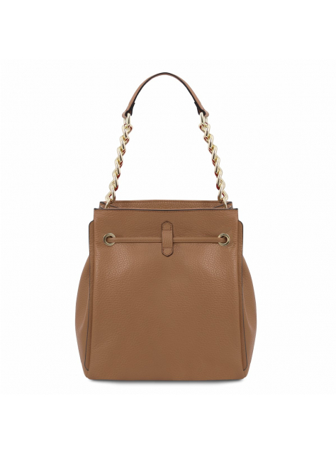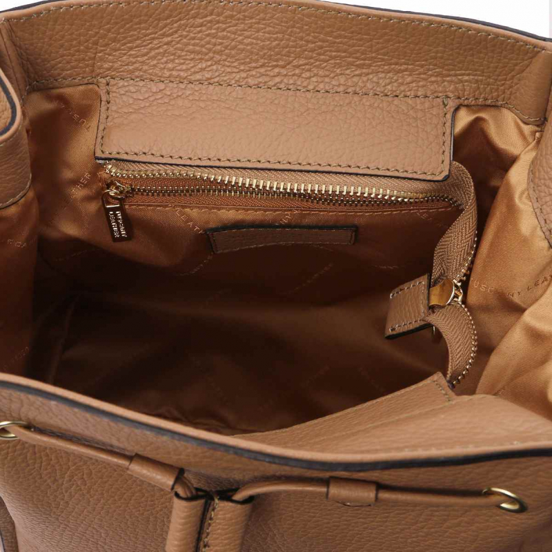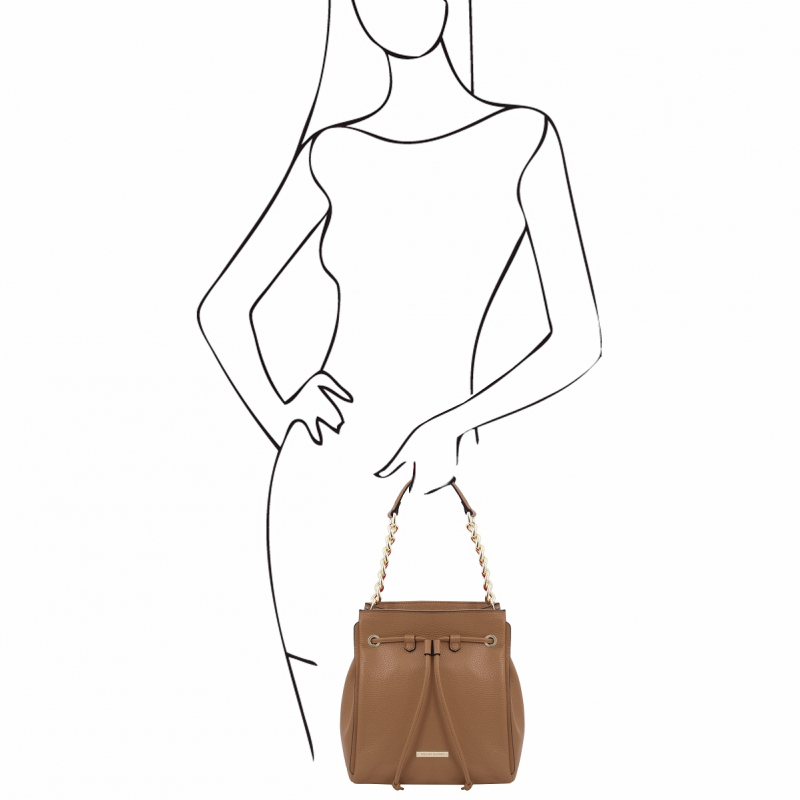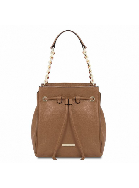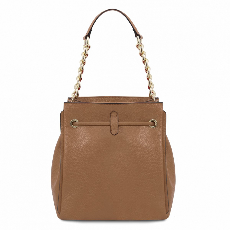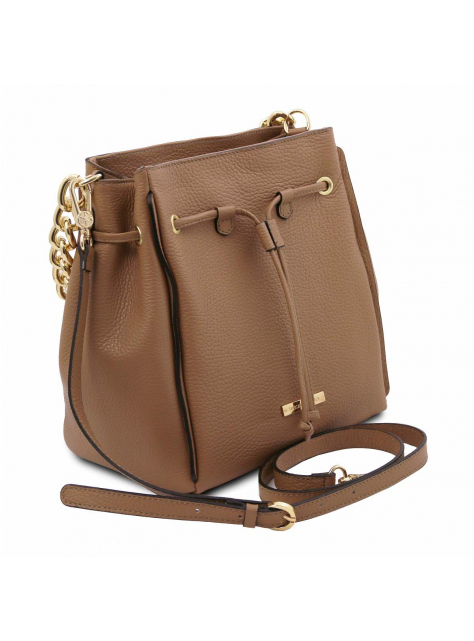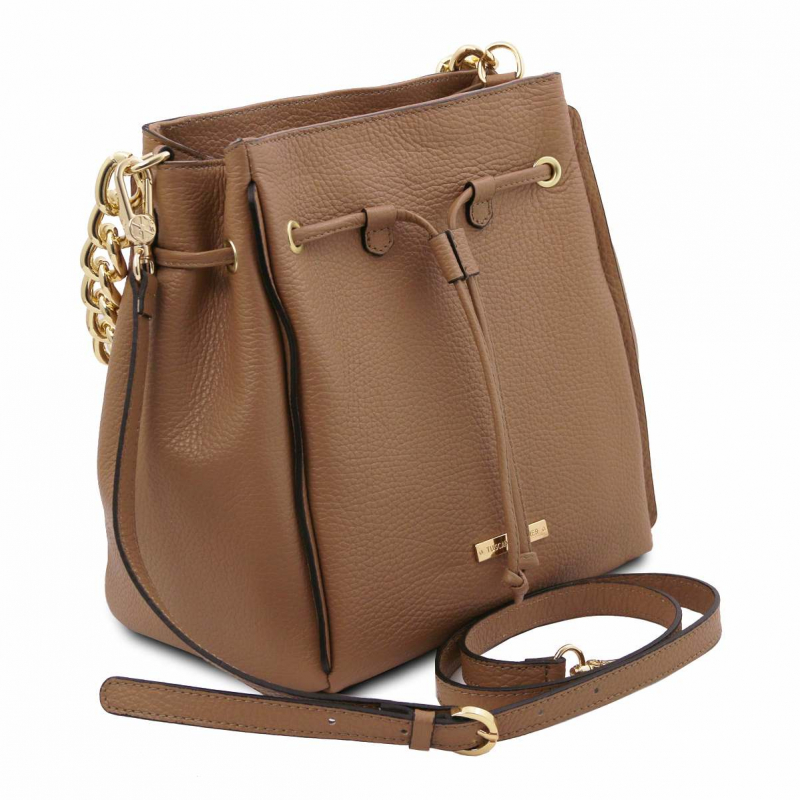 Trendová dámska kabelka zn. TUSCANY SOFT LEATHER BUCKET BAG z mäkkej poddajnej kože. Paktická štýlová kabelka v sýtej béžovej farbe oživí dámsky šatník.