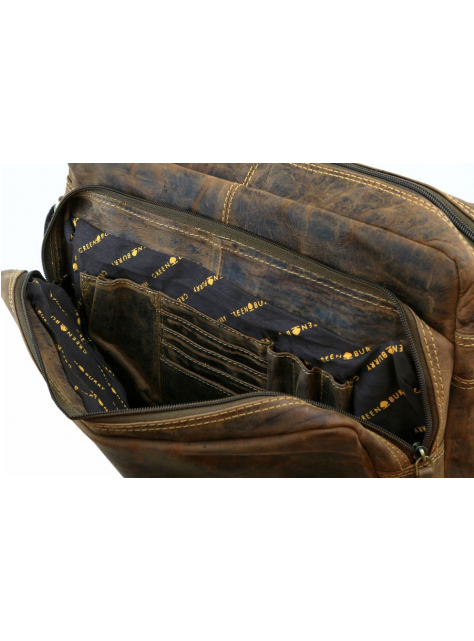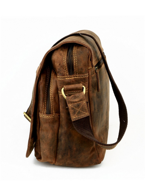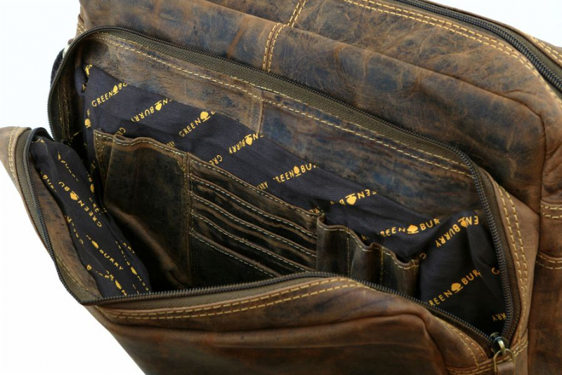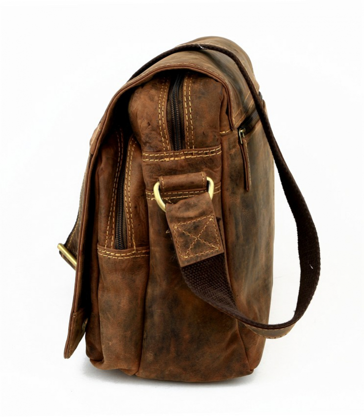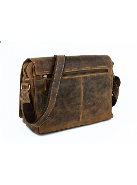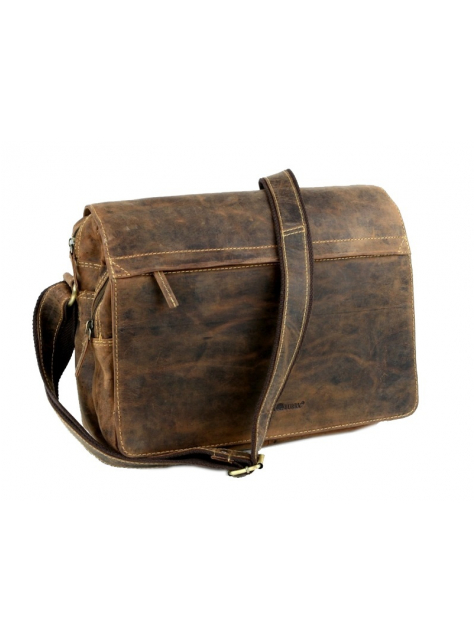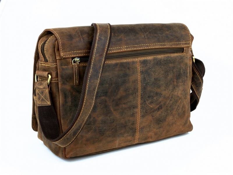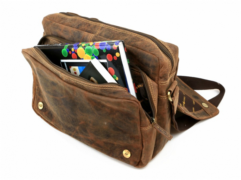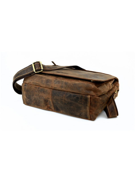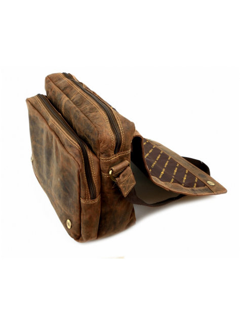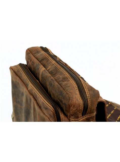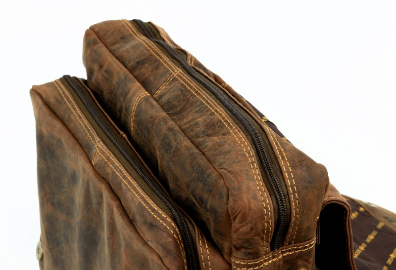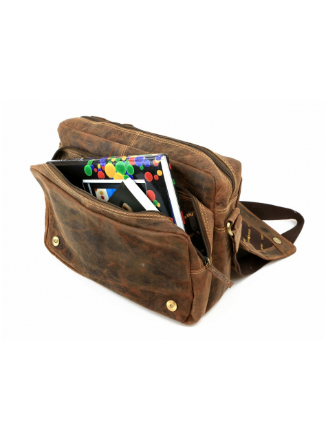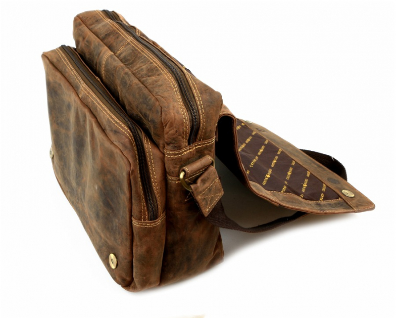 Taška na rameno alebo cez plece veľkosti XL s vystužením po celom vonkajšom obvode. Hlavný priestor vhodný na dokumenty veľkosti A4. Vyrobená z kvalitnej masívnej kože, povrch upravený jemným brúsením - zamatovo-hladký, matný povrch - tmavo-hnedá mramorovaná úprava VINTAGE Braun (vzhľad so starožitnou patinou). Masívna odolná koža, odľahčená pre pohodlné nosenie.