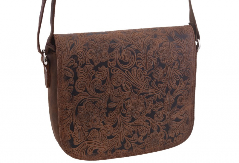 Koža s hlboko razeným kvetinovým motívom na prednej chlopni. Každý kus má originálny motív.