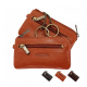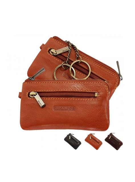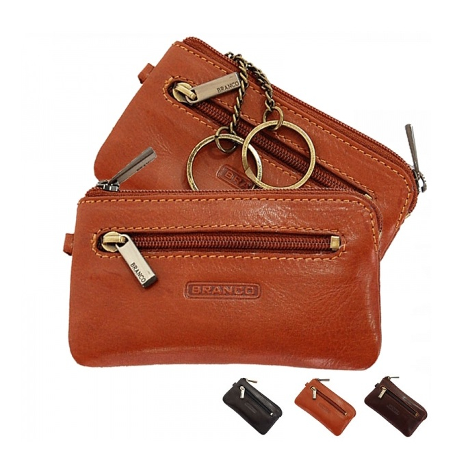 Kožená kľúčenka - puzdro na kľúče obsahuje vo vnútri 2 kovové krúžky na kľúče, bočný malý priečinok (na mince, žetóny a pod.). Uzatváranie na zips.
