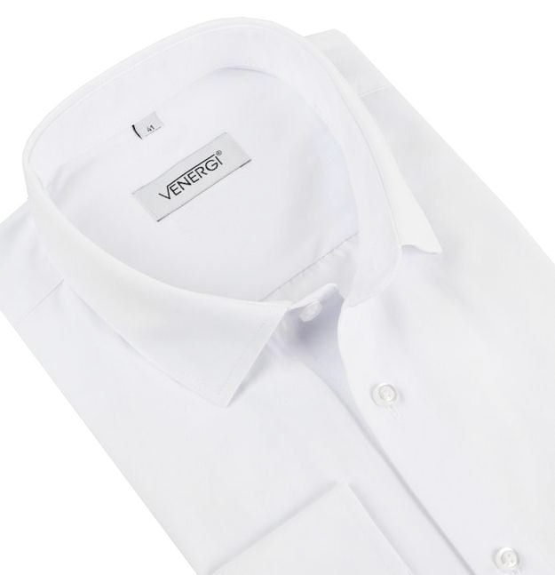 Elegantná biela pánska košeľa VENERGI na manžetové gombíky. Hladká tkanina elegantného vzhľadu, tzv. zmatnený satén.
